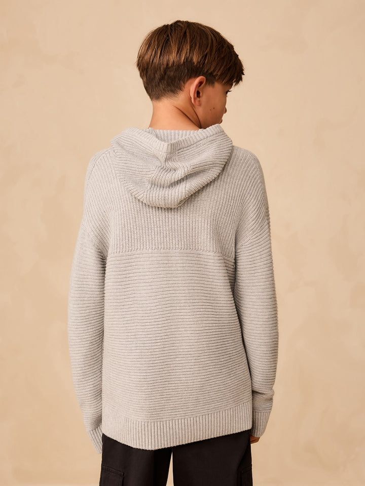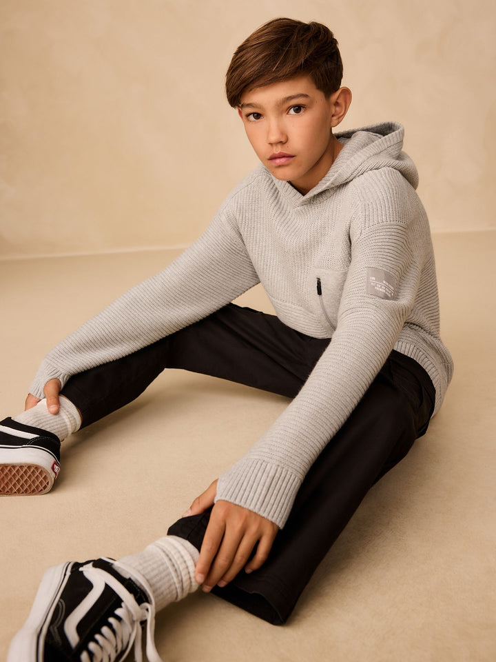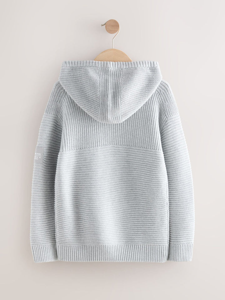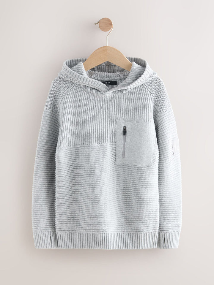 Stay warm and on-trend with this stylish grey utility knitted hoodie. The soft, knitted fabric and a subtle ribbed design provide a comfortable feel, while the pocket detail on the chest adds a modern touch. With a hood and a versatile colour, it's a perfect layering piece for a smart day at school or a casual day out. Knitted fabric Hooded Chest pocket Ribbed cuffs and hem 50% Cotton, 50% Acrylic. Country of Origin: Bangladesh