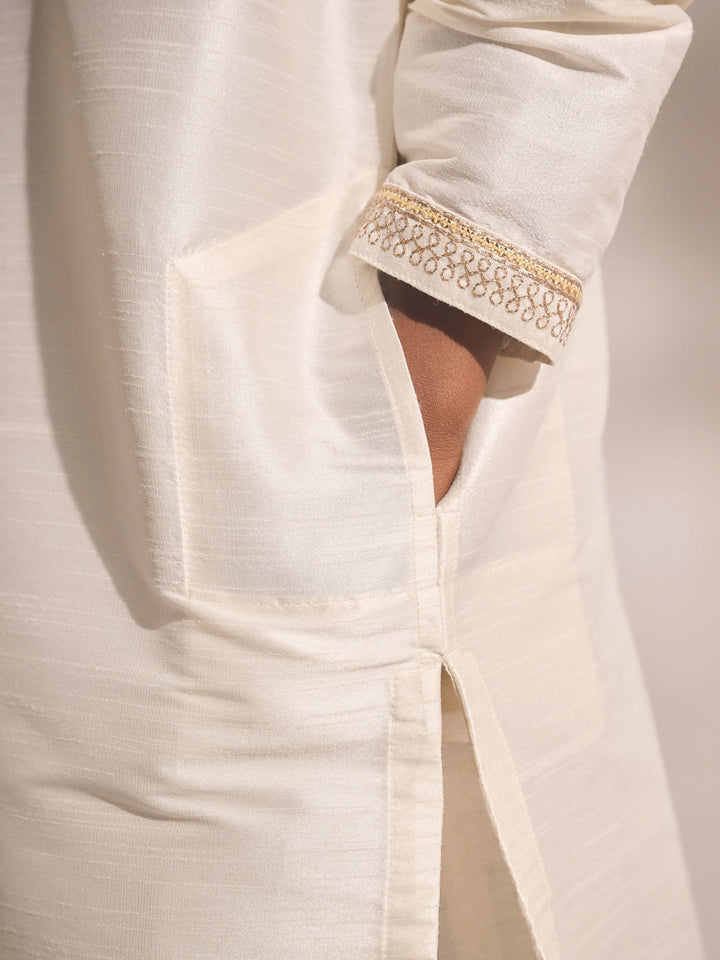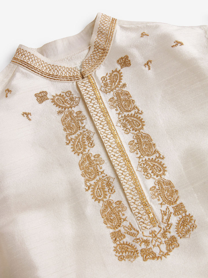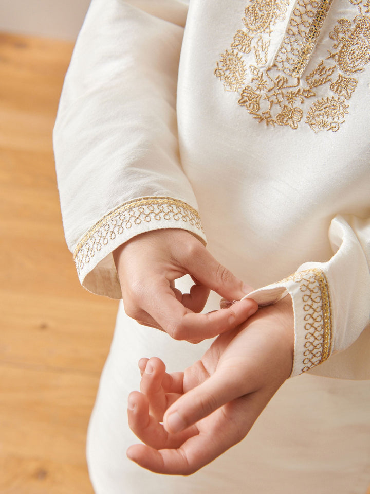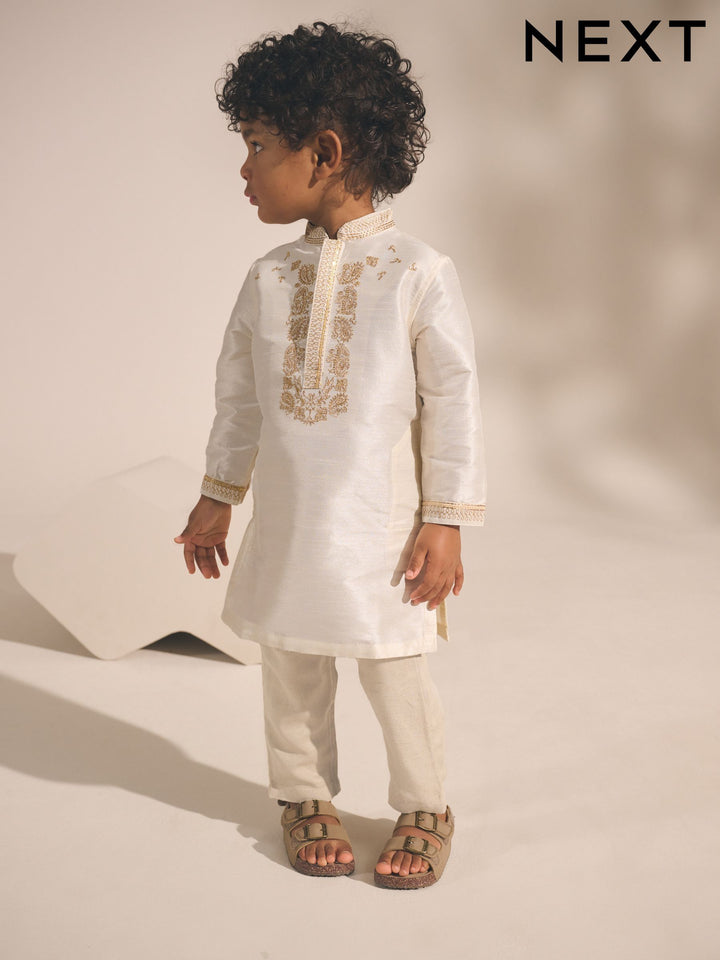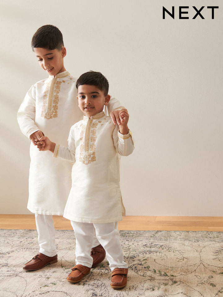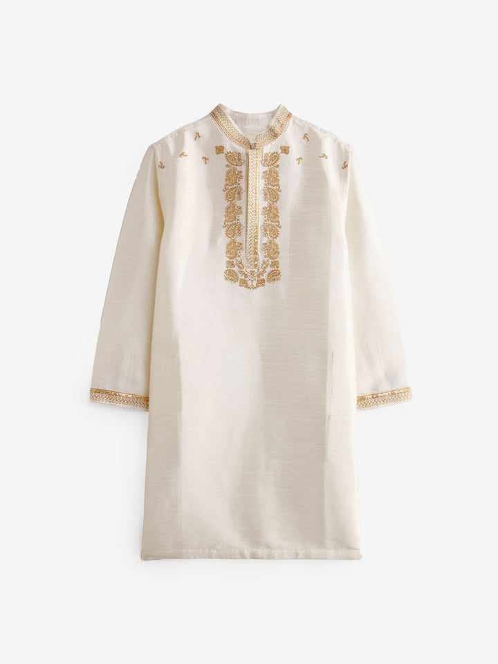 Whatever the special occasion, elevate his dressed-up looks with our boys embroidered ivory kurta. This classic kurta silhouette is adorned with intricate embroidery around the neck and collar area. Ideal for Eid, weddings or other festive events. Kurta shape Embroidered detail Long sleeves 100% Polyester. Country of Origin: India