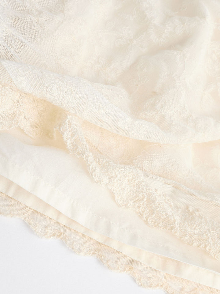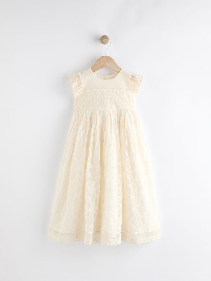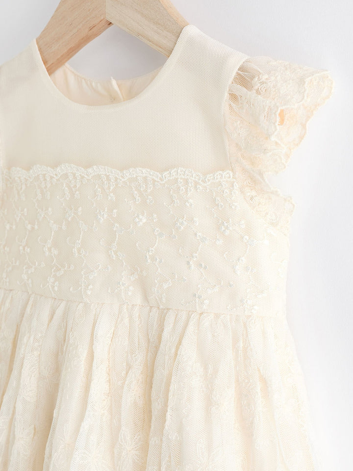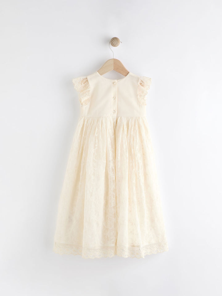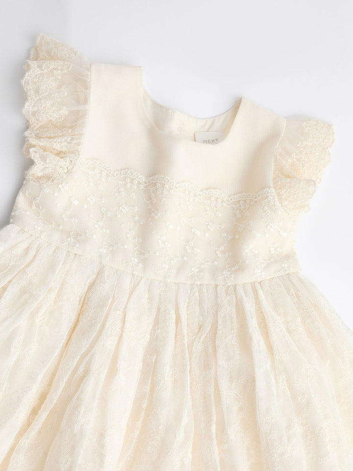 Decorated with pretty lace sleeves, detailed embroidery and a flowy skirted section, this longline dress is ideal for your baby when it comes to special occasions like family parties, birthdays and weddings. A cotton lining keeps things comfortable, finished with a button-up fastening. Regular fit Cotton lining Embroidered design Button-up fastening Machine washable. Main 100% Recycled polyester. Lining 100% Cotton. Country of Origin: India Warning: Keep away from fire and flames.