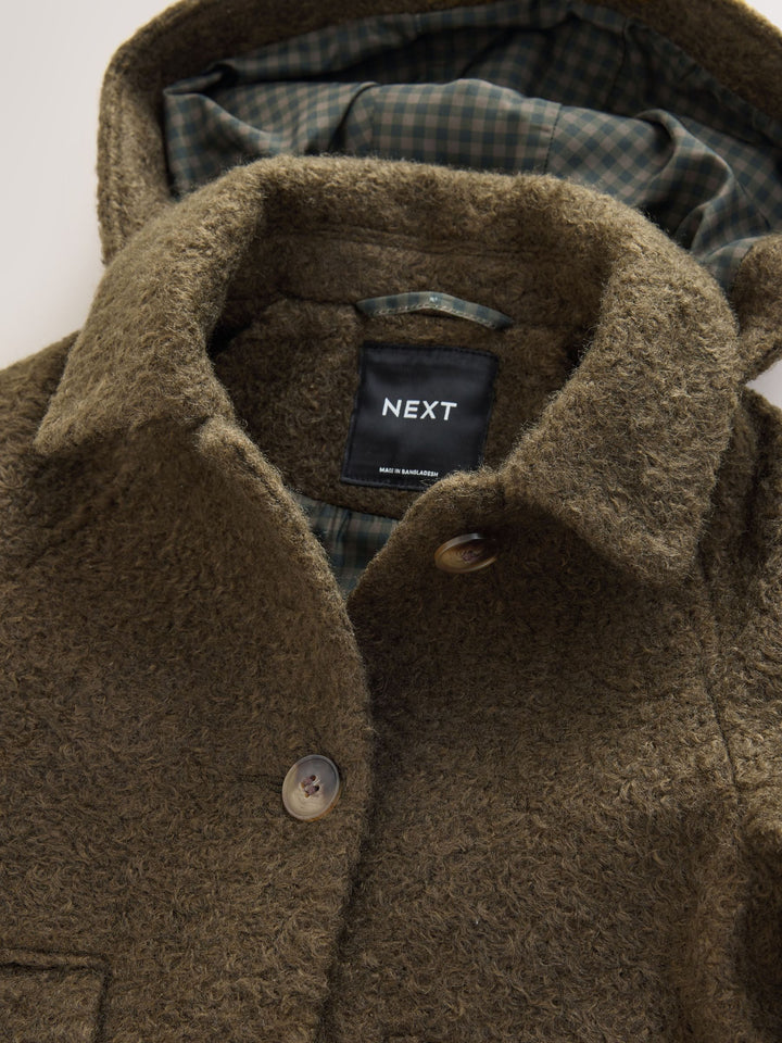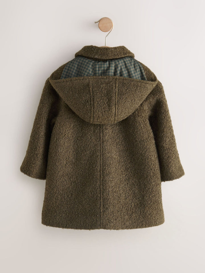 Stay warm and cosy in this classic khaki green coat. The relaxed fit and soft, wool-blend fabric provide a comfortable feel for all-day wear. With a hood, button fastening, and a playful printed lining, it's a stylish and practical choice for their outdoor adventures Relaxed fit Wool-blend fabric Printed lining Hooded Button fastening Side pockets Machine washable. Main 100% Polyester. Lining 100% Polyester. Country of Origin: Bangladesh
