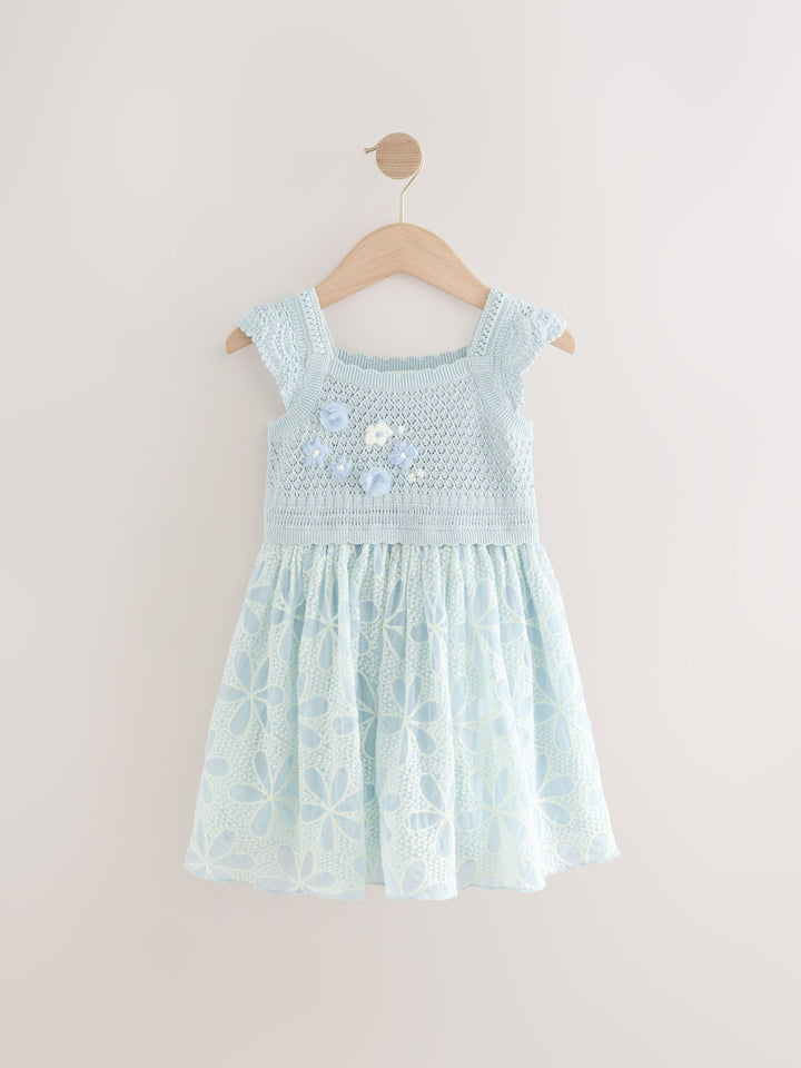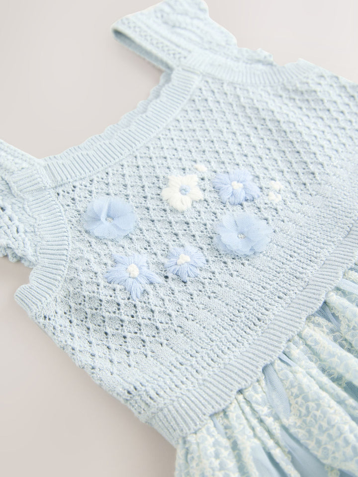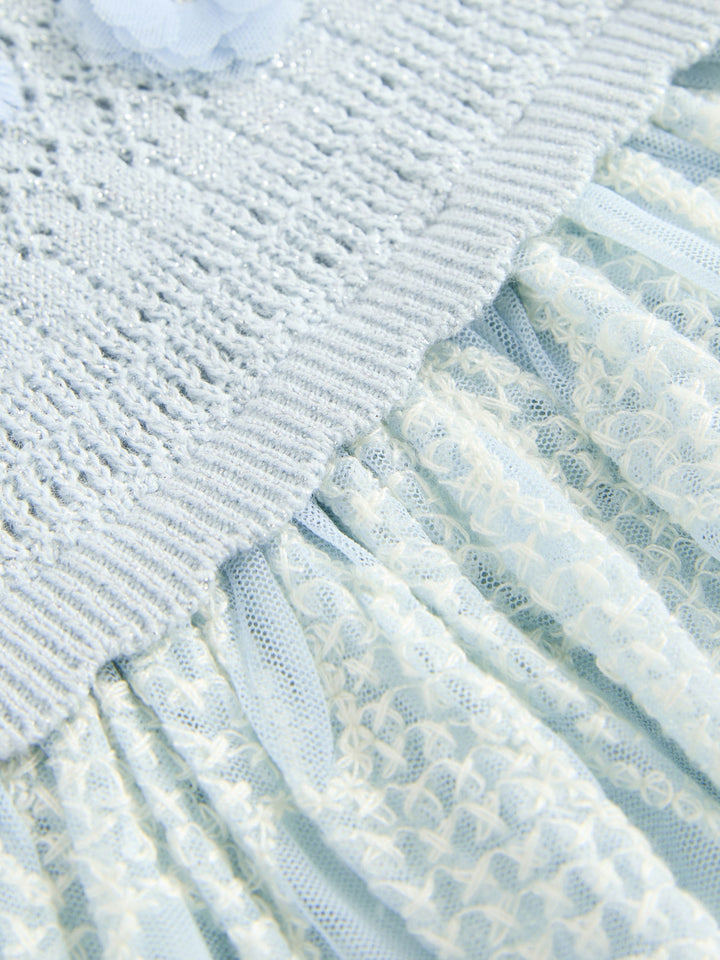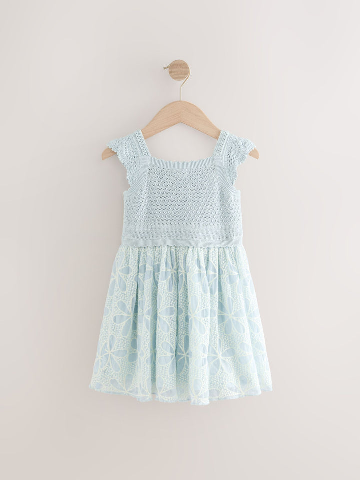This 2-in-1 light blue knitted dress has a knitted crochet bodice with embroidered detailing and a sleeveless shape, alongside a twirly mesh skirt. 2-in-1 Knitted bodice Crocheted detailing Mesh skirt Sleeveless Main 89% Cotton, 6% Metallised fibre, 5% Polyester. Mesh 100% Nylon. Embroidery 100% Polyester. Lining 100% Cotton. Country of Origin: India