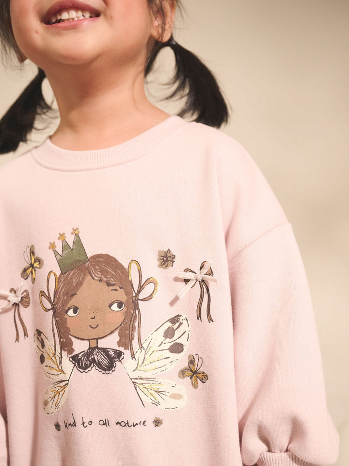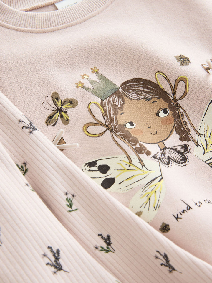 Let your little one's imagination take flight in our adorable pink fairy sweatshirt and flared leggings set. This charming two-piece outfit is designed for both magical adventures and cosy moments. Designed with sweet fairy and bow detail to sweater and matching ribbed leggings. 2 piece set Sweater Flared leggings Machine washable. Sweater 85% Cotton, 15% Recycled polyester. Leggings 56% Cotton, 38% Polyester, 6% Elastane. Country of Origin: Sri Lanka
