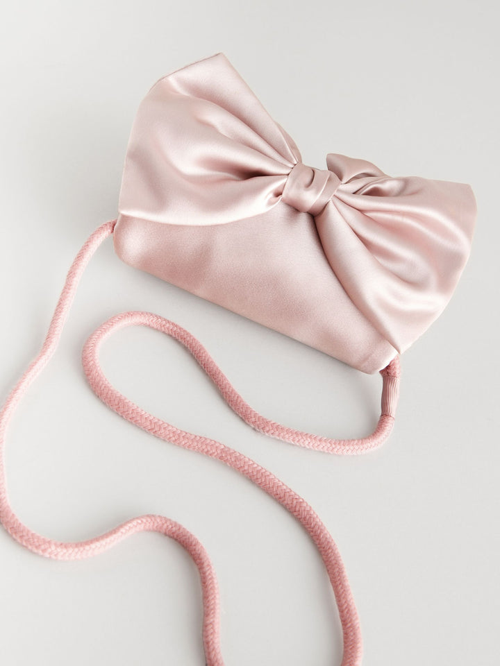 Perfect for special occasions or dressing up, this smooth light pink satin bag has an oversized bow design and a slim shoulder strap. Height 10.5cm Width 14cm Depth 4cm 100% Polyester. Country of Origin: China