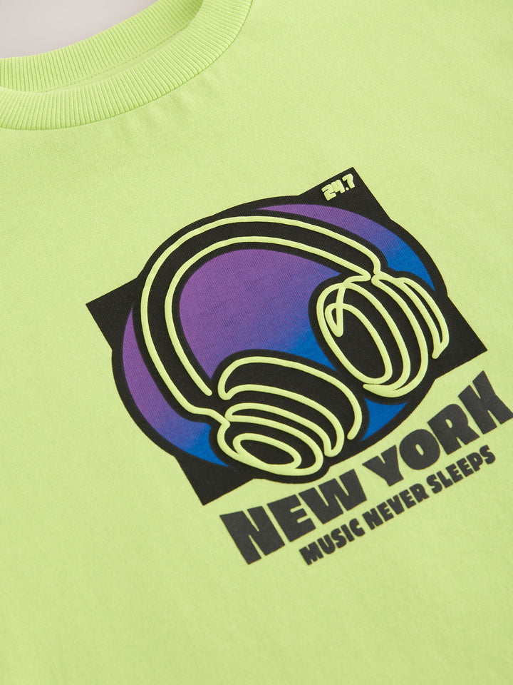 Add to their cool kid style with our relaxed fit lime green headphone print short sleeve t-shirt. With an eye-catching design and comfortable relaxed fit, they'll look as cool as they feel. 100% cotton Graphic print t-shirt Relaxed fit Short sleeves Comfortable fabric Machine washable. 100% Cotton. Country of Origin: Bangladesh