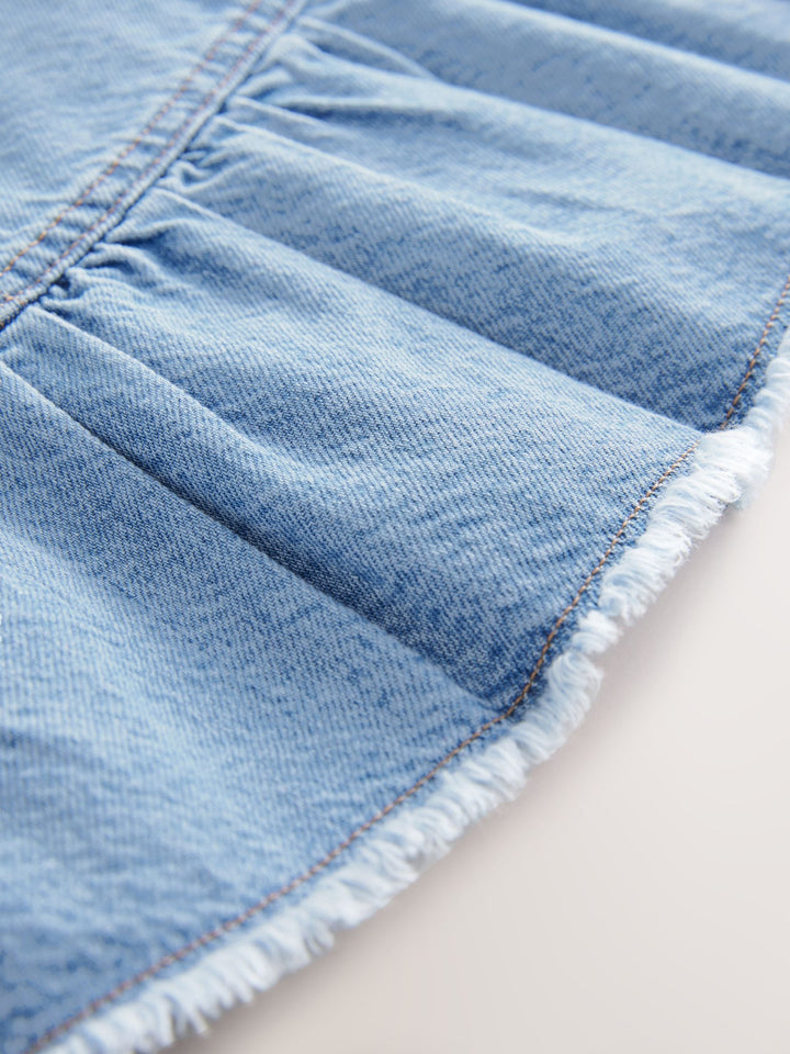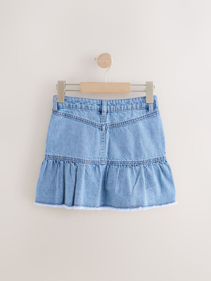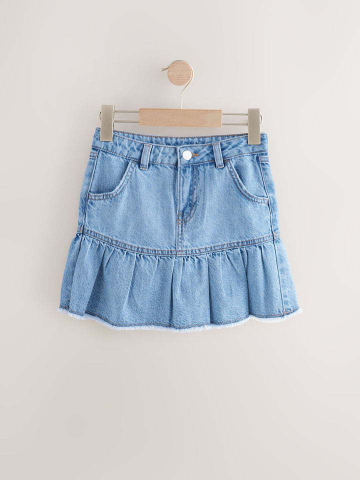 You can't beat a denim skirt. This shirt is made from pure cotton in a rigid denim fabric, featuring a pretty frill bottom with a raw hem, an inner adjustable waist for the perfect fit, a button and zip fastening and a mid-blue wash. 100% cotton denim Frill detail Raw hem Inner adjustable waist 100% Cotton. Country of Origin: Bangladesh