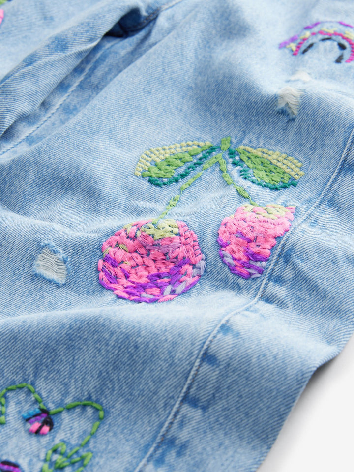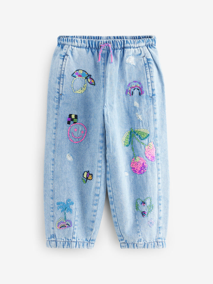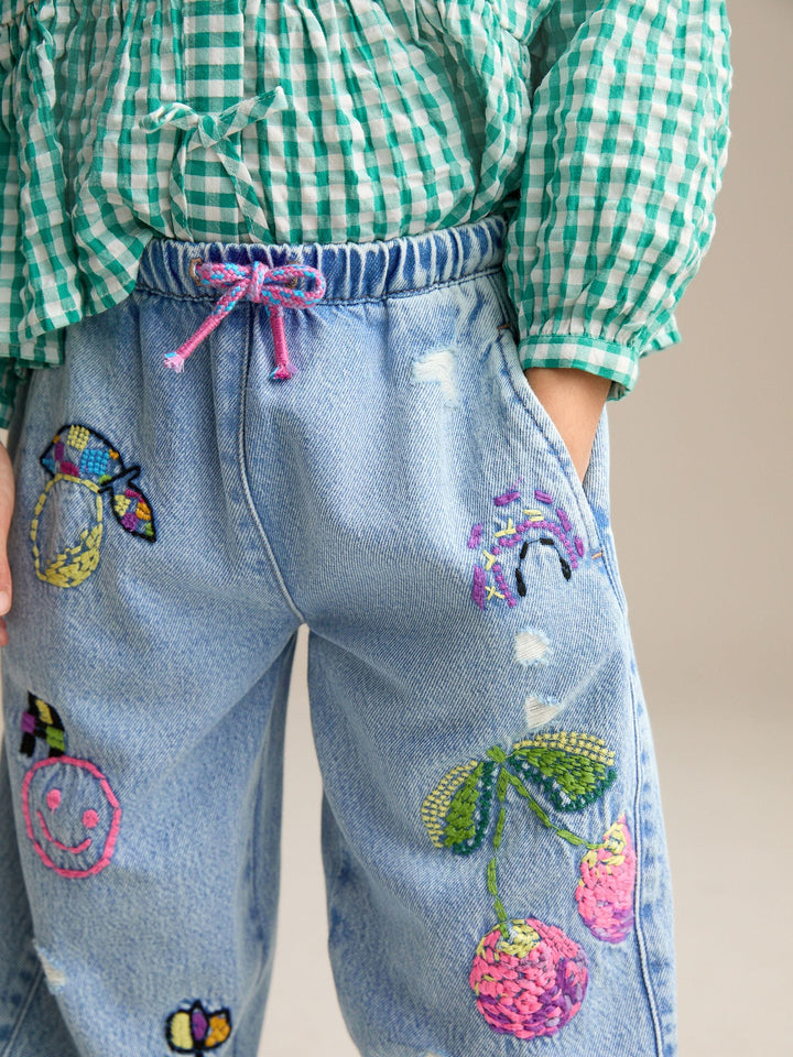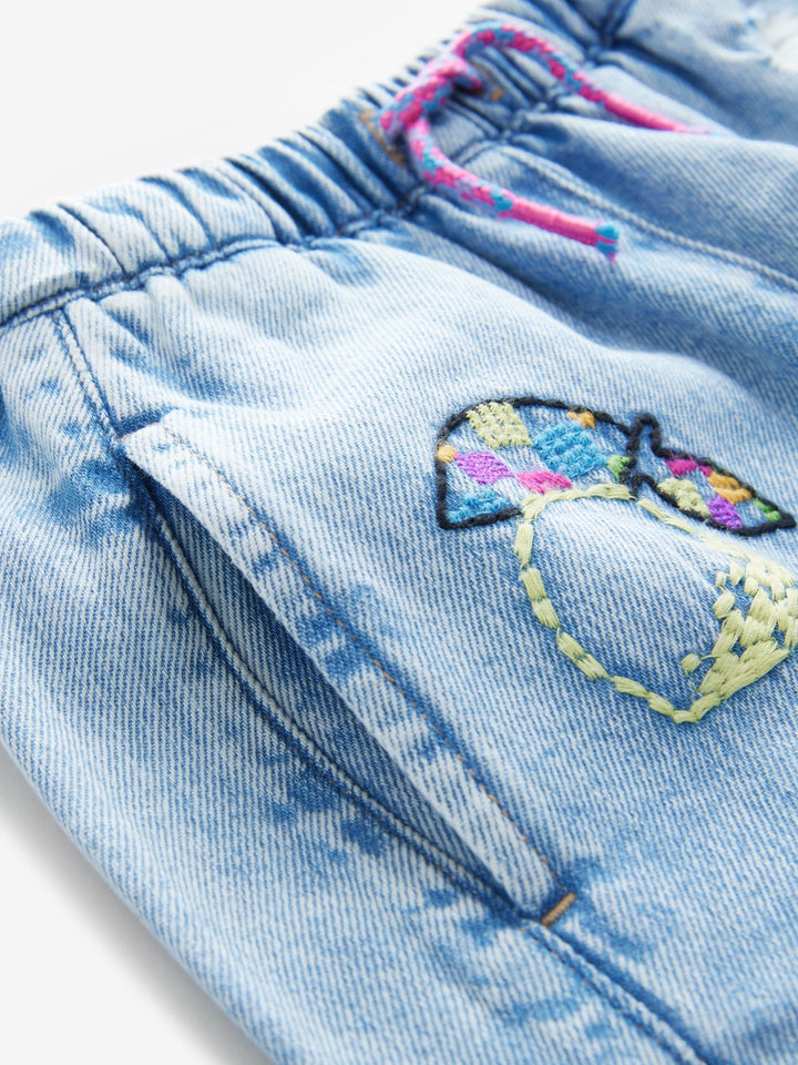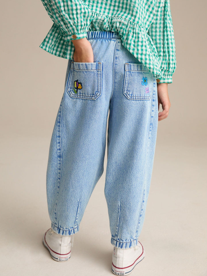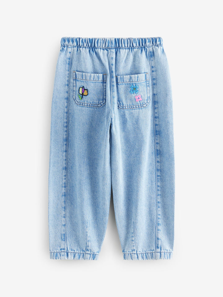 Mid Blue Pull On Embroidered Barrel 100% Cotton Jeans (3-16yrs)
