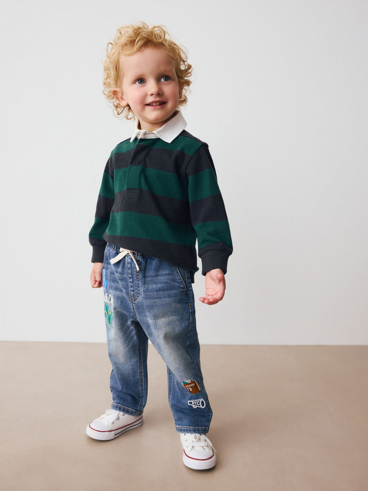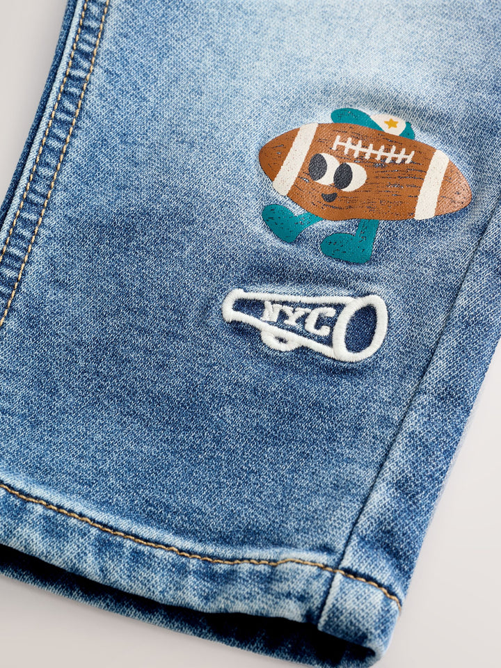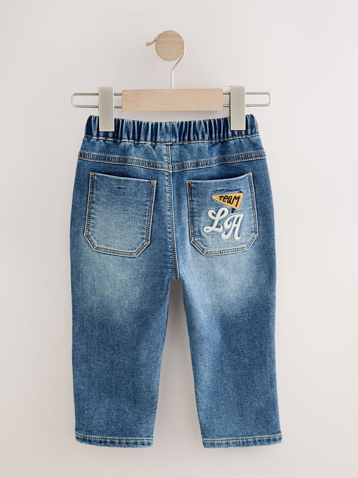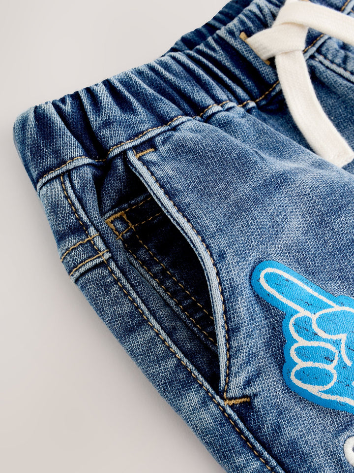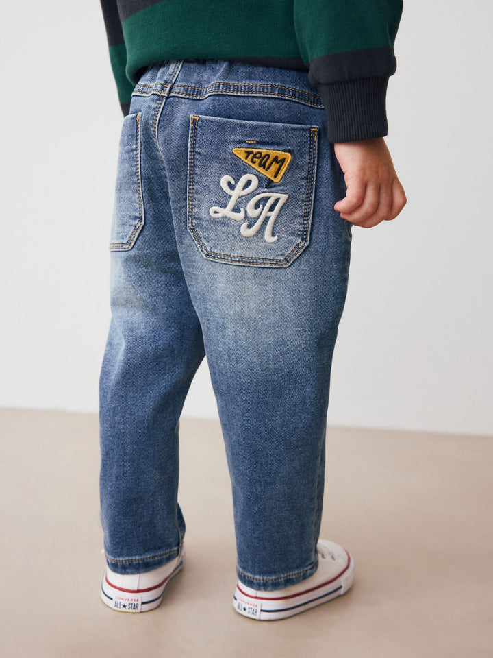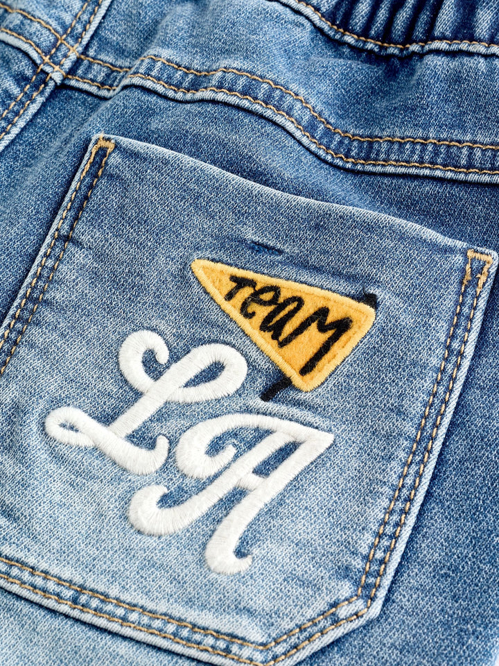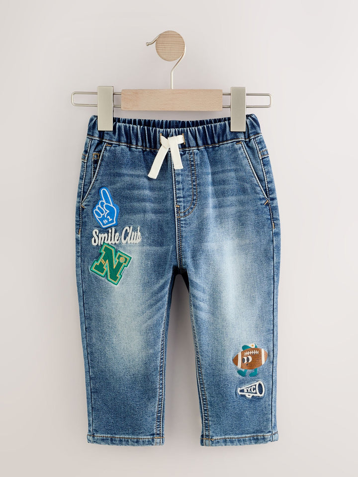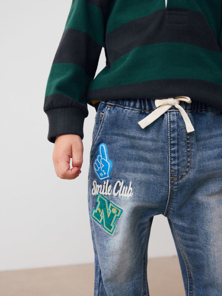 Perfect for casual days, these blue pull-on jeans offer both comfort and style. The soft material and an elasticated waistband with a drawcord provide a comfortable fit, while the fun embroidered patches add a playful touch.Embroidered patches Pull-on style with a drawcord waistband Soft-hand feel material 56% Cotton, 28% Viscose, 15% Recycled polyester, 1% Elastane. Country of Origin: Cambodia