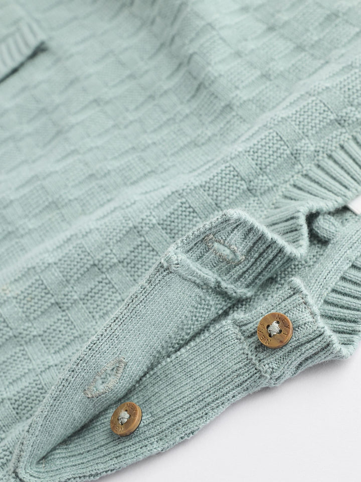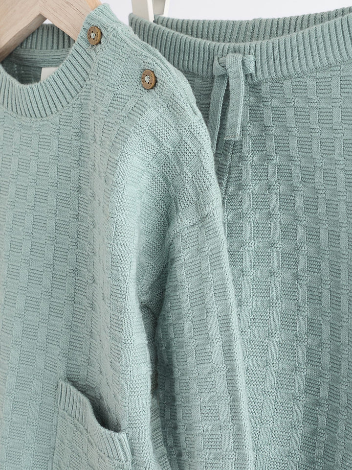 An easy addition to your little one's wardrobe, this 2-piece set in a mineral colour is designed in a lovely textured knit. Featuring a crew neck, ribbed hem top with long sleeves, patch pockets and button fastenings to the shoulder alongside matching pull-on trousers with ribbed cuffs and tie detail to the waist. 2-piece set Long sleeve top Patch pockets Button fastening Matching leggings Machine washable. Jumper and Leggings 100% Cotton. Country of Origin: Bangladesh Warning: Keep away from fire and flames.