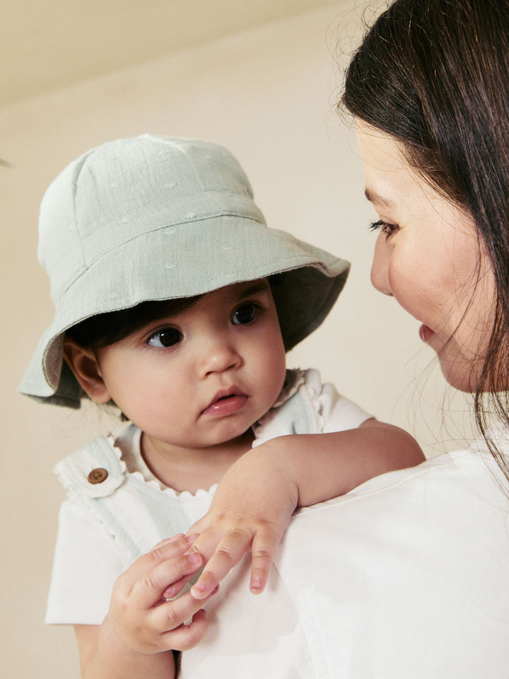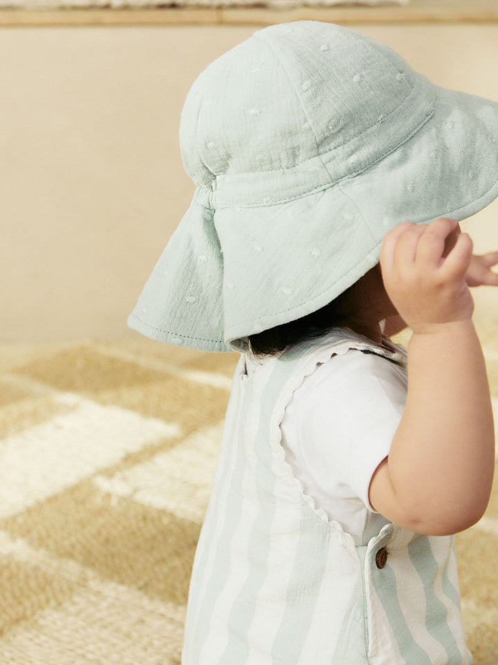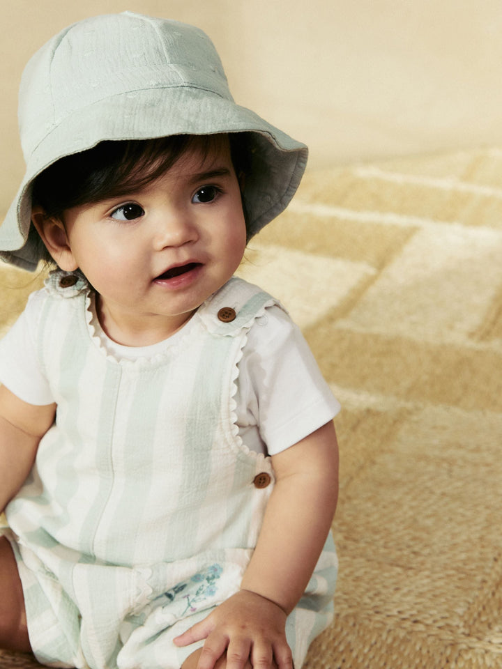 Keep her head protected with our 2 pack of mint green/ecru hats. Crafted from pure cotton, each hat has a wide brim for added coverage and is elasticated for a snug fit. 2 pack 100% cotton Wide brim Elasticated 2 x Hat Main 100% Cotton. Lining 100% Cotton. Country of Origin: China Warning: Keep away from fire and flames.