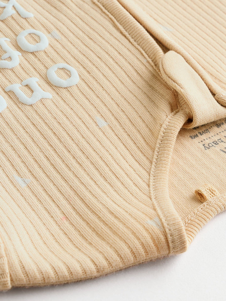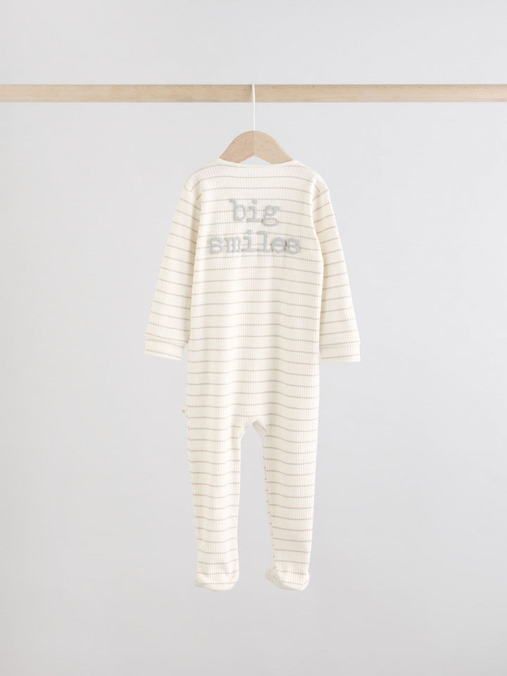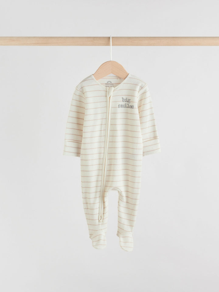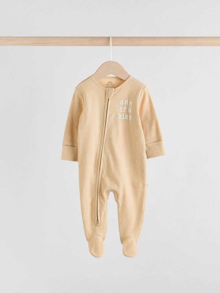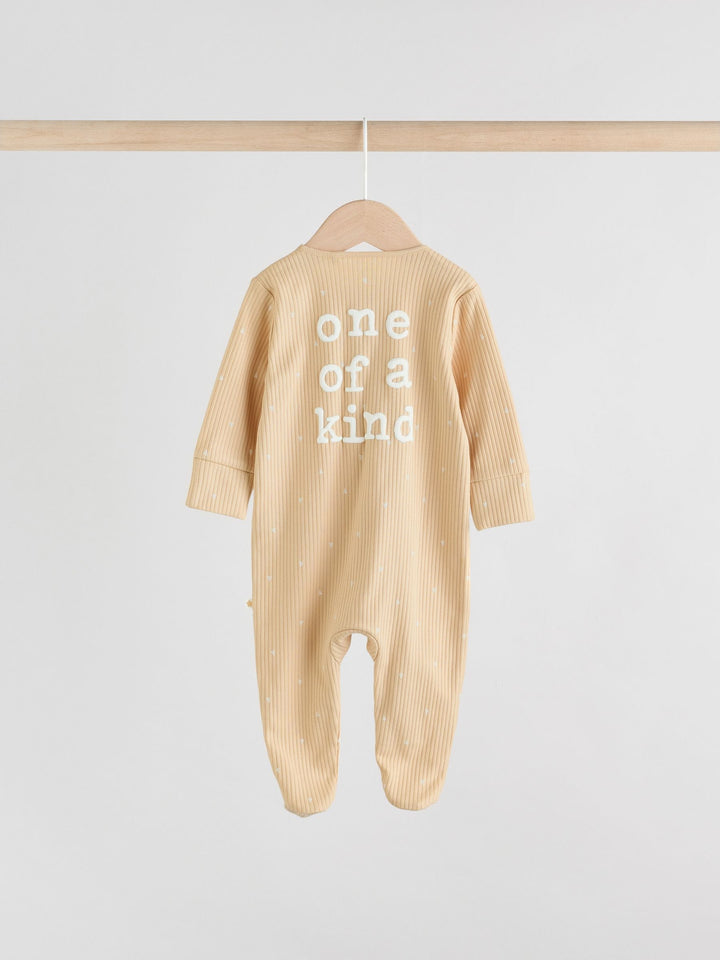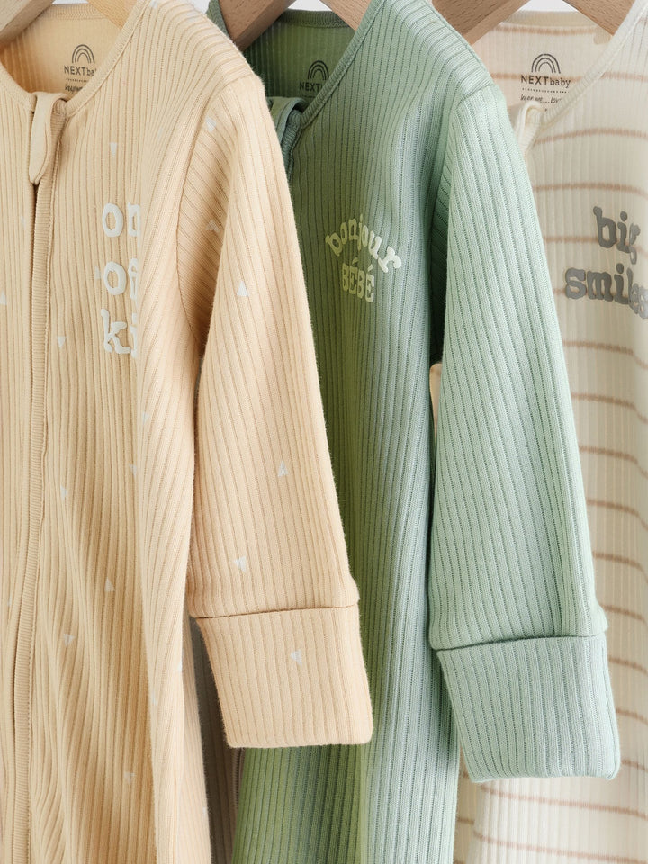 This 3-pack of sleepsuits are comfortable and colourful, perfect for stocking-up on their sleepwear. Each sleepsuit features a two-way zip fastening for easy changing, made from pure cotton with a ribbed texture and a chest and back puff print featuring cute slogans. Turn-back scratch mitts are included up to 3-6 months for added comfort, alongside anti-slip sole prints from 9-12 months and inner lined feet. 3-pack 100% cotton Two-way zip fastening Puff prints Ribbed texture Machine washable. 3 x Sleepsuit 100% Cotton. Country of Origin: India Warning: Keep away from fire and flames.