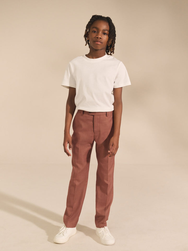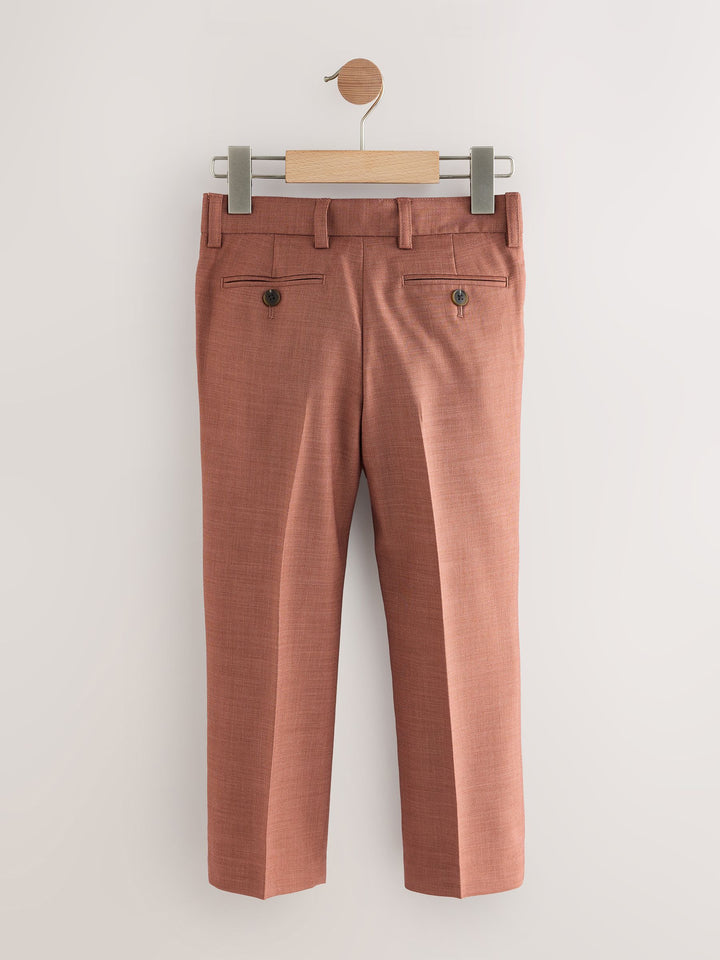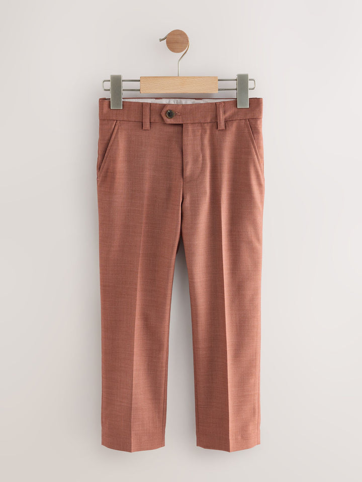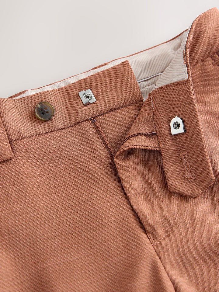 These classic Mocha Brown trousers are perfect for matching with a suit or for school, featuring a handy adjustable waist for a comfortable fit. The trousers feature a smart central crease, side slip pockets, button-through welted back pockets and a button and zip fastening. Adjustable waist Smart central crease Side slip pockets Button-through rear pockets Machine washable. 82% Polyester, 17% Viscose, 1% Elastane. Country of Origin: Vietnam
