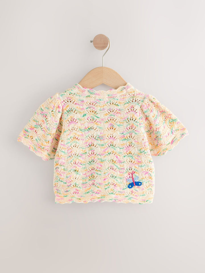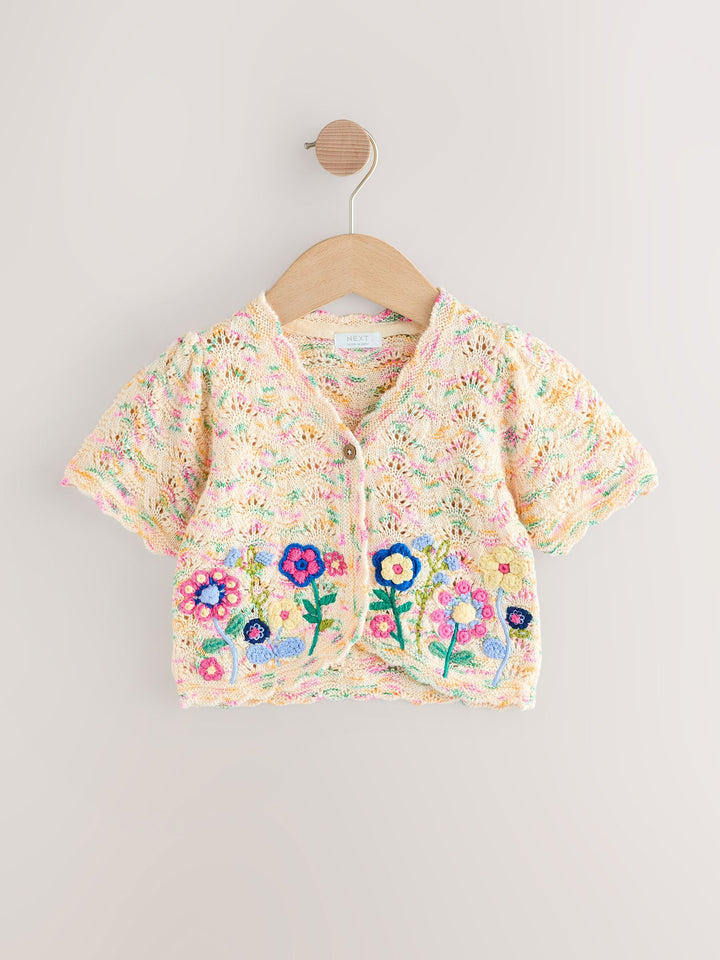 Introduce some flower power to her look with this knitted cardigan. In a short sleeve silhouette with button-down fastening, this summer piece is coated in vibrant embroidered flowers for a fun finish. Short sleeves Soft knit Embroidered flower design V-neckline Button-through fastening 65% Acrylic, 35% Polyester. Country of Origin: India