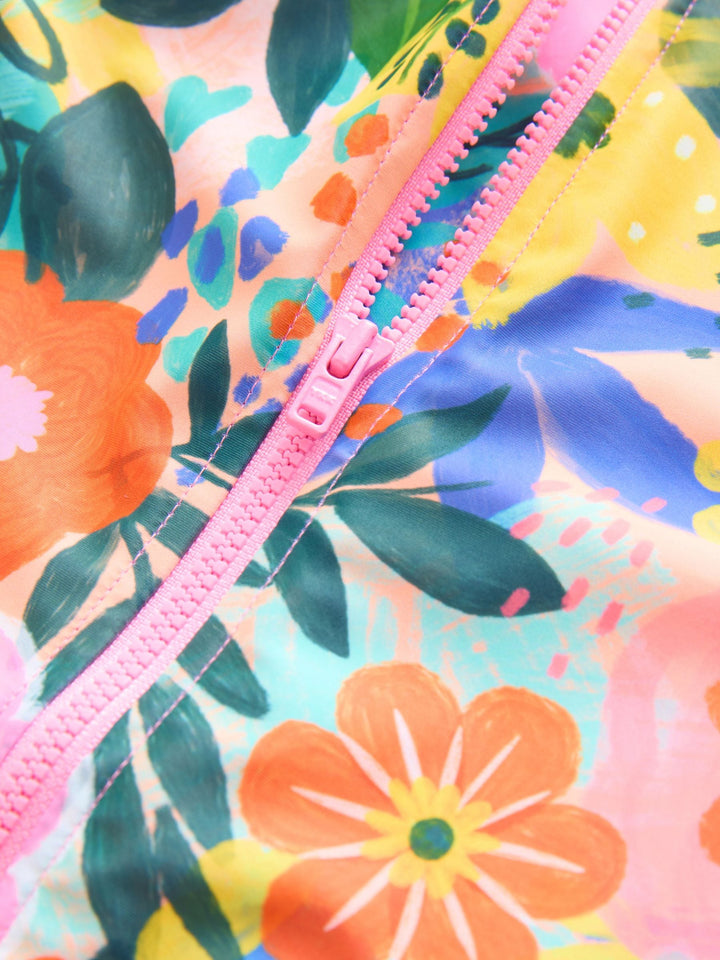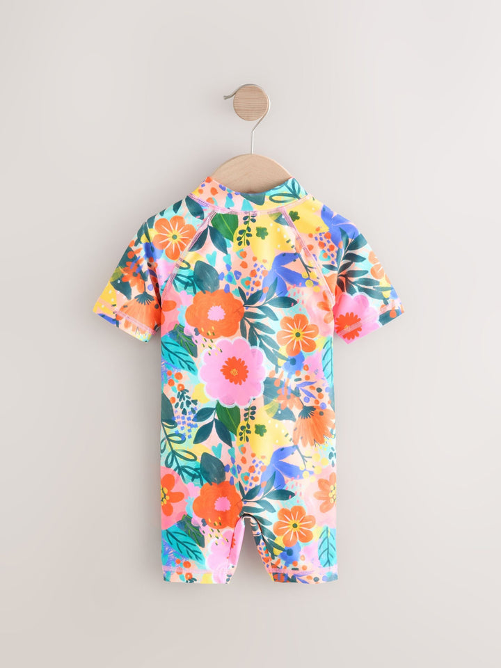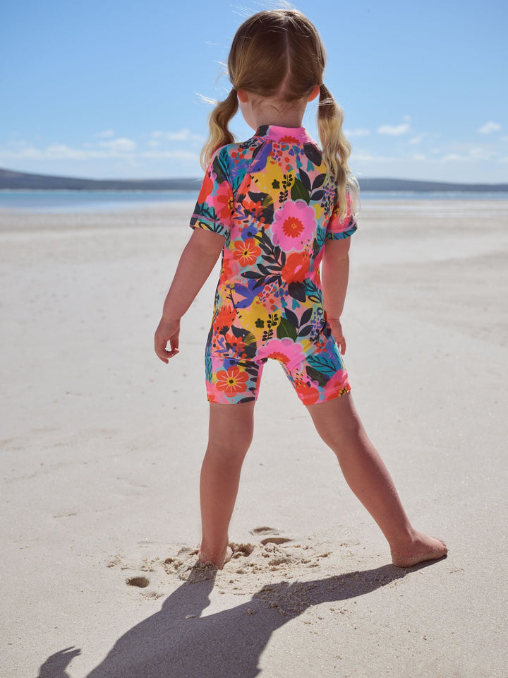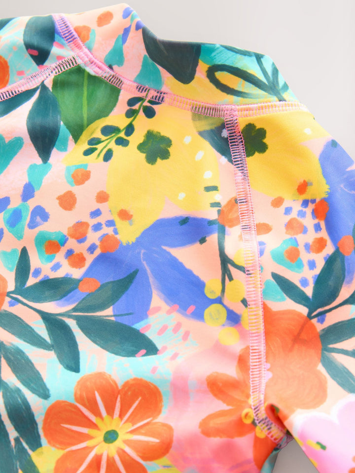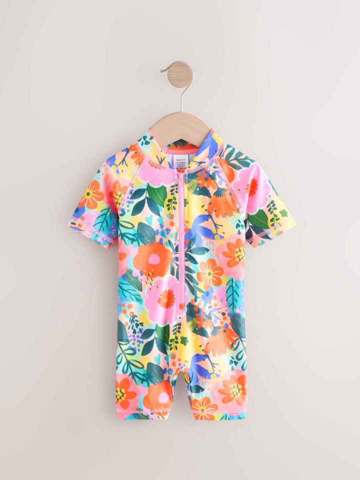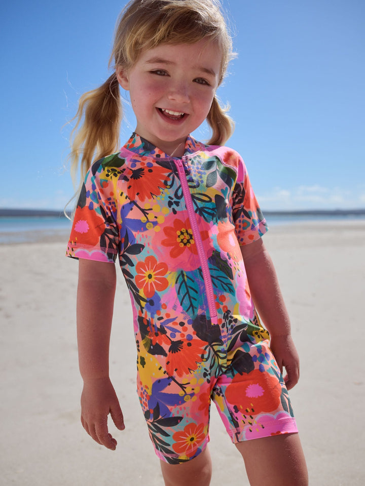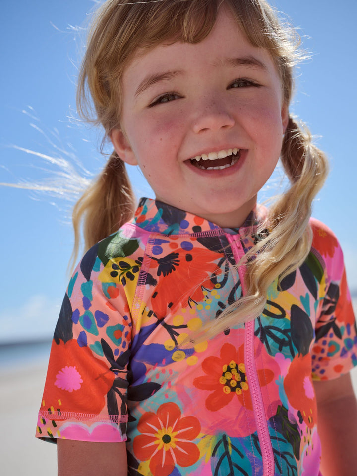 This multi-coloured floral print short sleeve swimsuit is made from a sunsafe and stretchy fabric with a UPF rating of 50+, with a zip fastening for easy dressing, a tall collar and raglan sleeves. Stretchy fabric UPF rating of 50+ Zip fastening Tall collar Short sleeves Main 84% Recycled polyester, 16% Elastane. Lining 92% Recycled polyester, 8% Elastane. Country of Origin: China This fabric will provide protection against solar ultraviolet radiation. It has been independently tested and given a UPF rating of 50+ which blocks more than 97.5% of UV rays. Important Advice: • Sun exposure causes skin damage • Only covered areas are protected • Always use a high protection factor sunscreen on any exposed areas of skin • The protection offered by this fabric may be reduced with use or if stretched or wet • Always rinse in fresh water after each use • Young children should be kept in the shade between 11 and 3 • Don't forget your hat and sunglasses. • Fabric provides UVA +UVB protection from the sun.