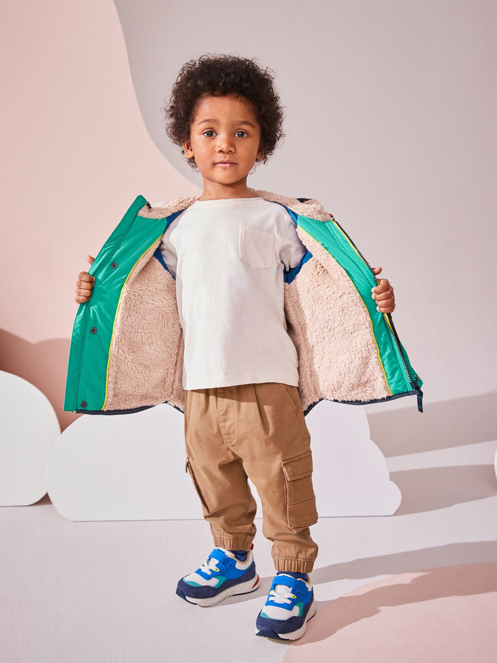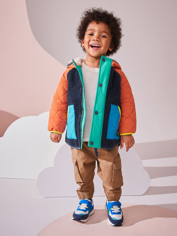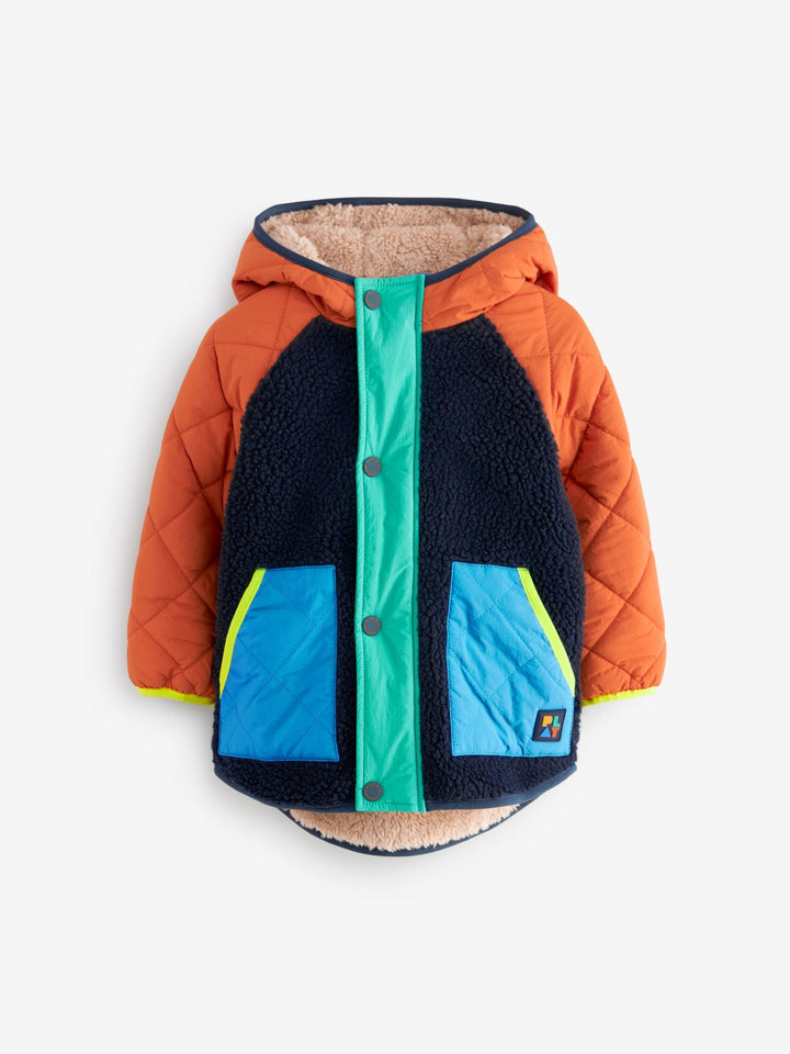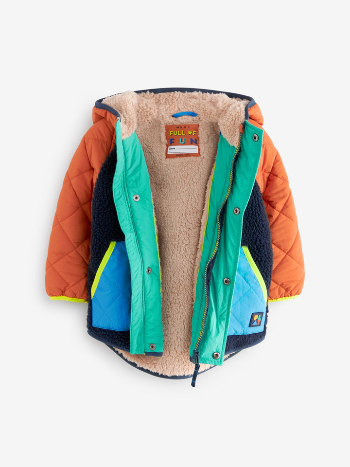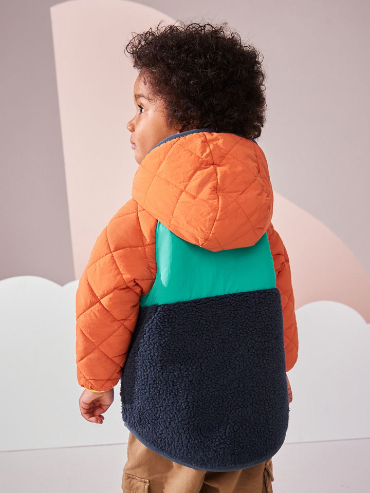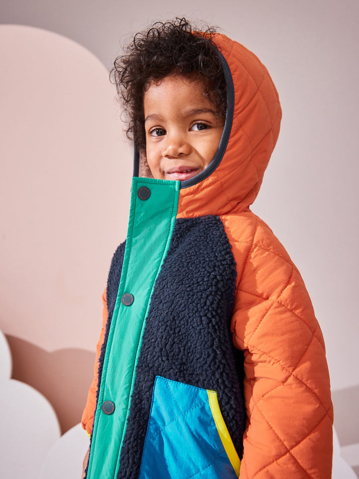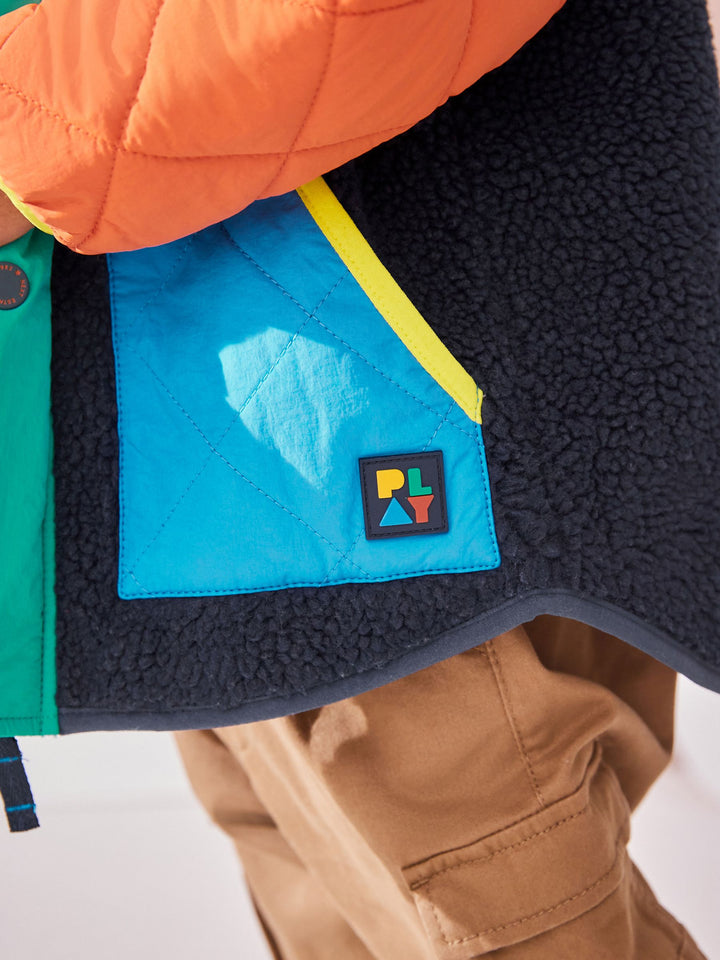 This cosy quilted jacket has a retro colour-blocked design, with cosy borg fleece and quilted panelling, a popper fastening for easy wear, borg lining and dual side pockets, finished with elasticated sleeve cuffs. Regular fit Popper fastening Quilted panelling Borg fleece panelling and lining Side pockets Branded patch Main 100% Polyester. Sleeves 100% Nylon. Hood 100% Nylon. Lining 100% Polyester. Wadding 100% Recycled polyester. Country of Origin: China