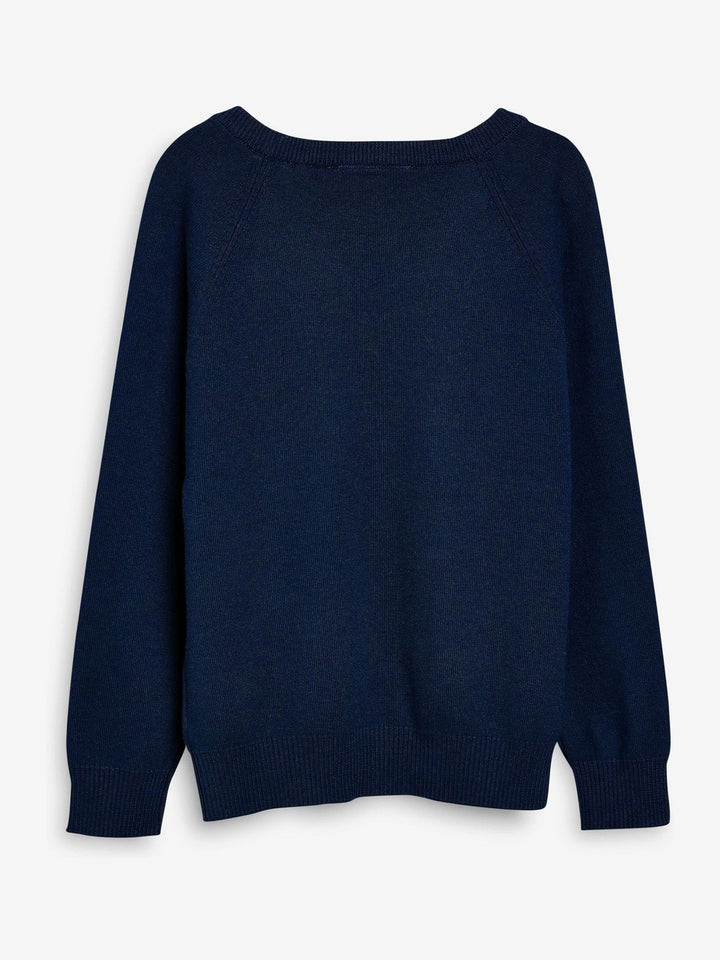 In a cotton-rich knitted fabric, this smart and cosy navy blue jumper is perfect for layering alongside their uniform, in a convenient 2-pack to keep them stocked up. The jumper features a ribbed V-neck collar with raglan sleeves and ribbed hems.Key features: Cotton-rich blend Ideal for layering V-neck collar Ribbed hems Machine washable. 2 x Jumper 82% Cotton, 18% Nylon. Country of Origin: Bangladesh