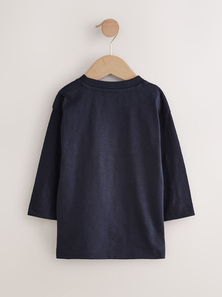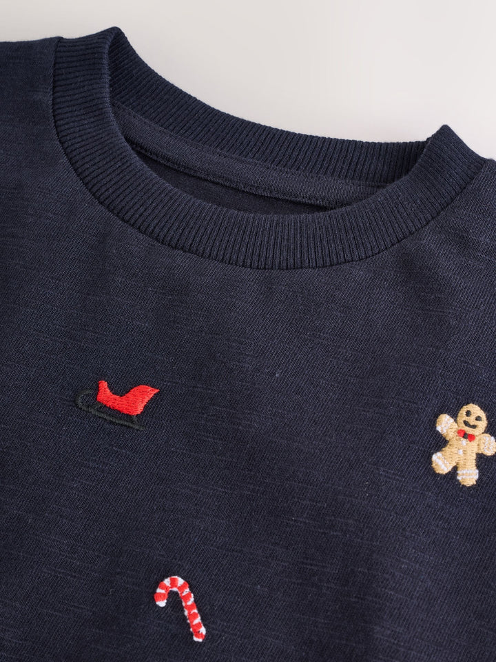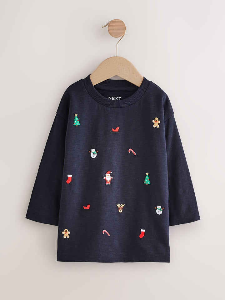 Navy All-Over Embroidered Christmas Long Sleeve T-Shirt (3mths-7yrs)