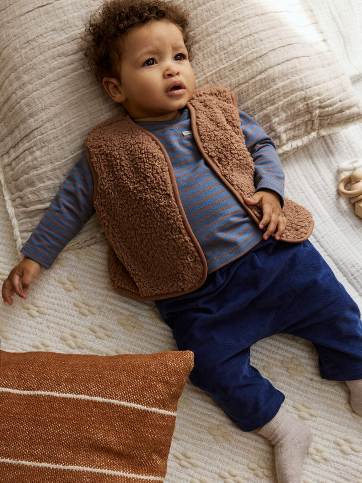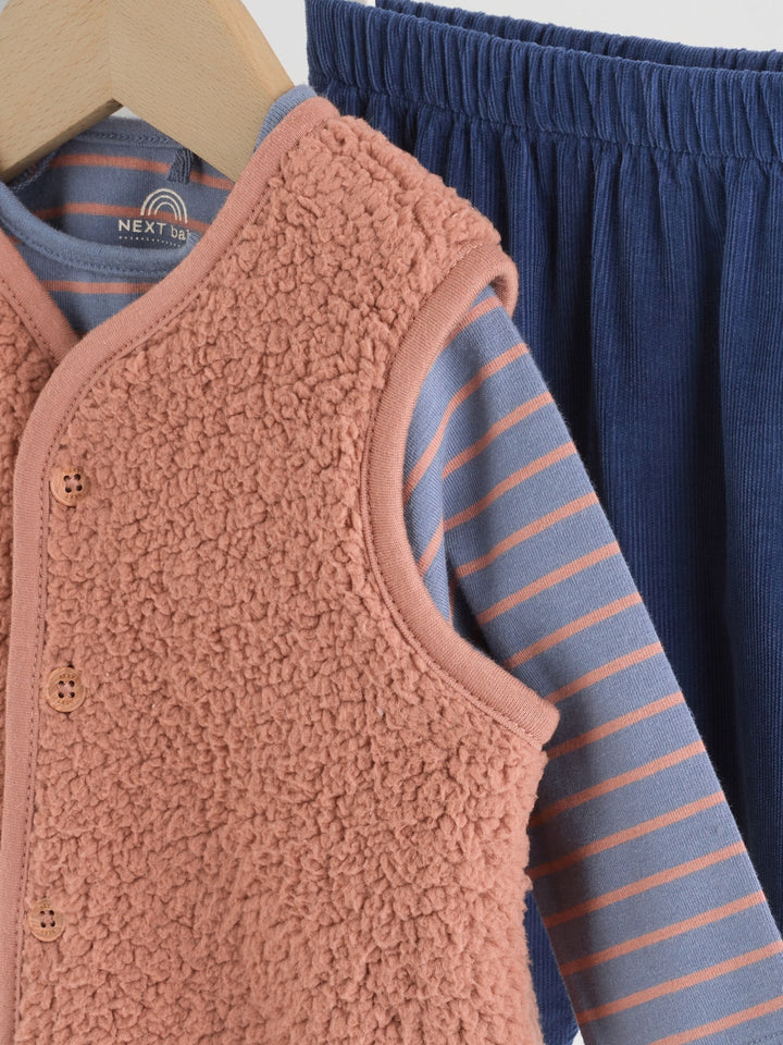 Machine washable. T-shirt 95% Cotton, 5% Elastane. Gilet Main 100% Recycled polyester. Lining 100% Cotton. Trouser 100% Cotton. Country of Origin: Sri Lanka Warning: Keep away from fire and flames.