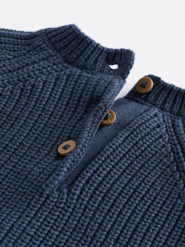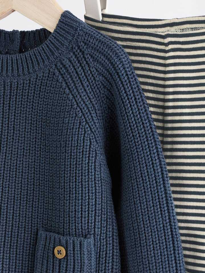 This 2-piece set is a cosy outfit for your little one, featuring a knitted long sleeve top with a pure cotton construction and a ribbed design, raglan sleeves and button-through pockets, alongside a pair of stretchy leggings with an elasticated waistband. 2-piece set Long sleeve top Knitted cotton fabric Button-through pockets Raglan sleeves Stretchy leggings Elasticated waistband Machine washable. Jumper 100% Cotton. Leggings 95% Cotton, 5% Elastane. Country of Origin: Bangladesh Warning: Keep away from fire and flames.