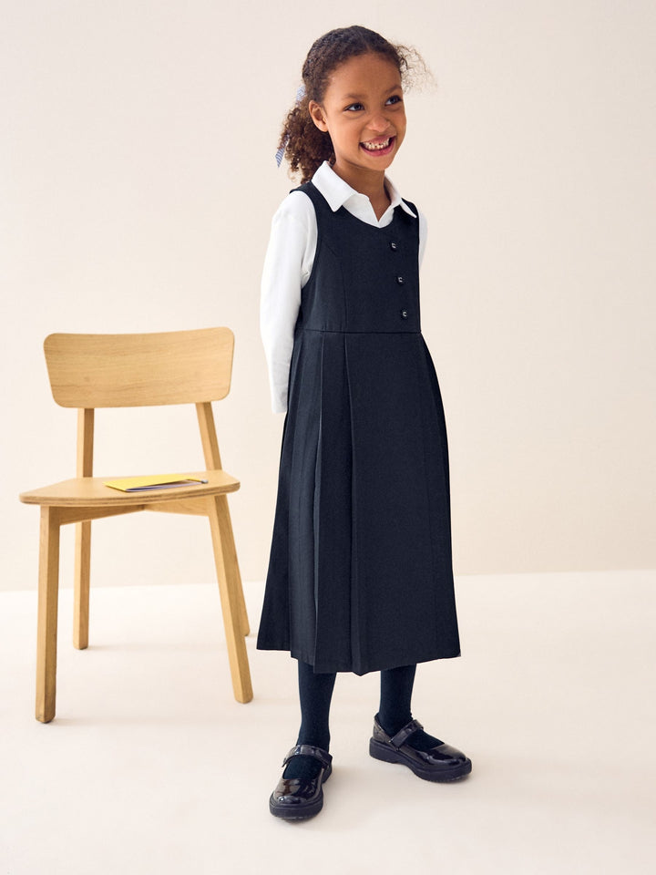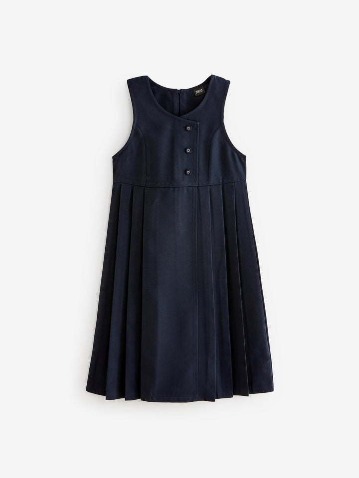 This blue school pinafore features button detail at the front with functional zip fastening at the back. Designed with a longer-length smart pleated skirt and asymmetric bodice shape, this pinafore is coated with a stain-resistant Teflon® finish to keep it cleaner for longer. Key Features: Easy Iron fabric - Handy easy-iron finish Teflon® Technology - Teflon EcoElite™ is a non-fluorinated plant-based finish that repels water and water-based stains for easy cleaning and quick drying. Visit www.teflon.com/ecoelite for more information Machine Washable Pleated skirt Longer Length Asymmetric button detail with zip fastening at the back Machine washable. 65% Recycled polyester, 35% LENZING™ ECOVERO™ Viscose. Country of Origin: Sri Lanka