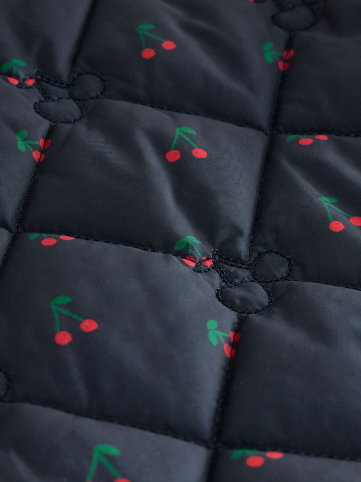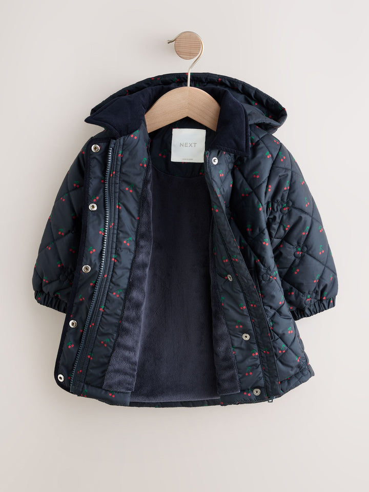 Perfect for their everyday adventures, this stylish navy cherry coat offers a blend of fashion and function. The shower-resistant outer and cosy fleece lining provide great protection, while the embroidered quilted outer and plush cord collar add a polished finish. Shower resistant Embroidered quilted outer Cord collar Fleece Lined Machine washable. Main 100% Recycled polyester. Lining 100% Recycled polyester. Wadding 100% Recycled polyester. Country of Origin: China