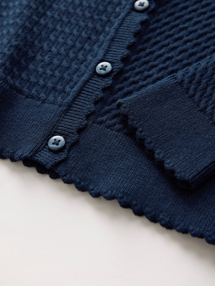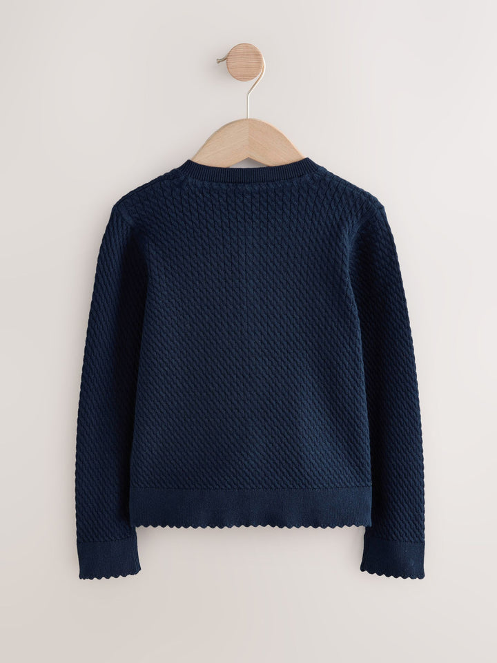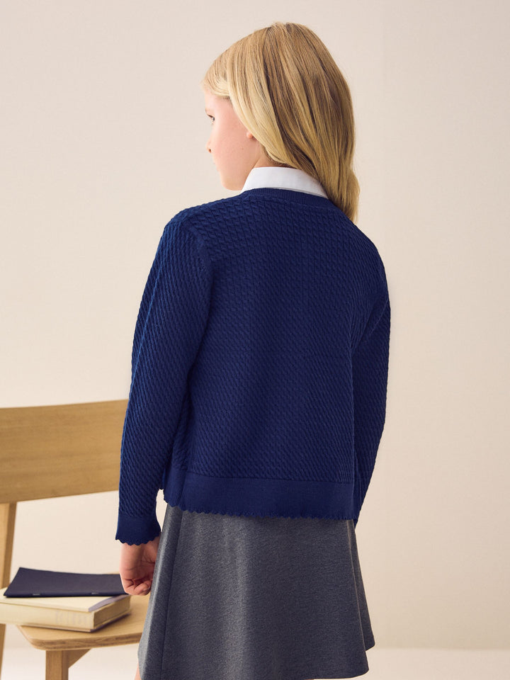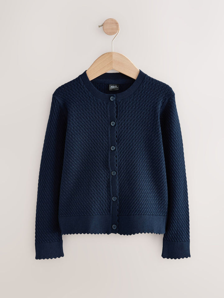Designed in a soft cotton-blend yarn for ultimate comfort and breathability, this navy round neck cardigan features a cable knit design finished with pretty scallop edging. The perfect layer to complete their school uniform. Lasting Colour - Lasting colour properties to ensure colours stay vibrant and bright wash after wash. Cotton Rich - Cotton rich blend for ultimate comfort and breathability. Button-through Cable knit Scallop edging Round neck Machine washable Machine washable. 80% Cotton, 20% Nylon. Country of Origin: Bangladesh