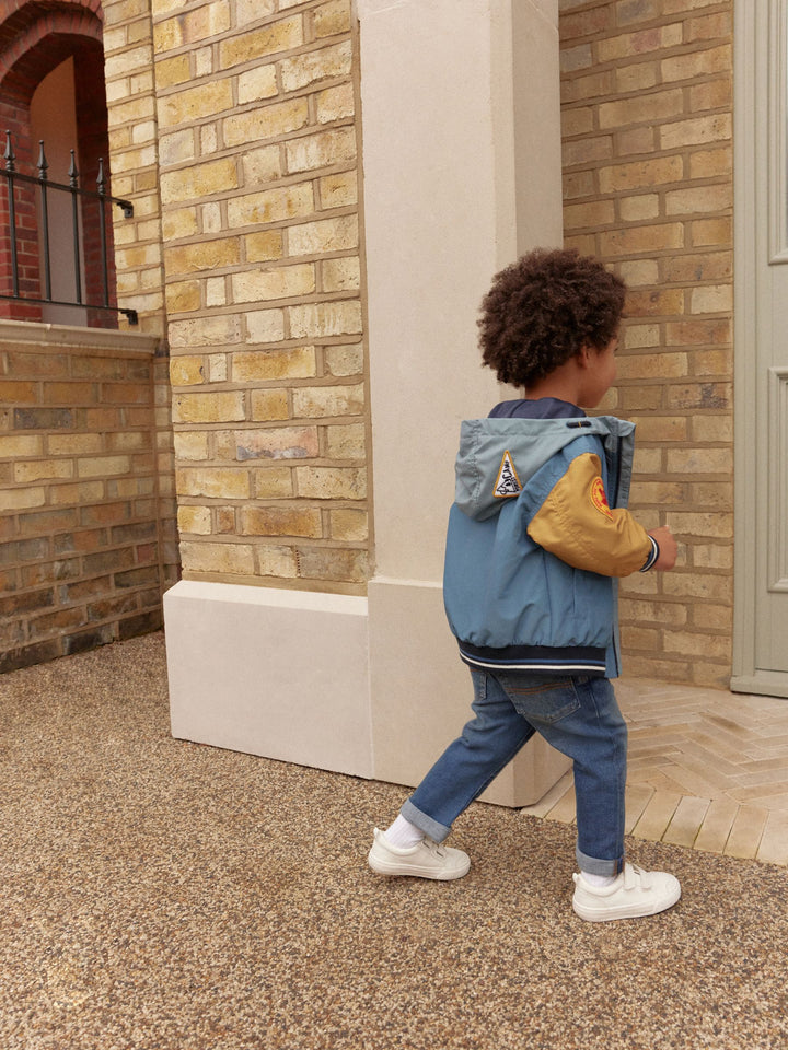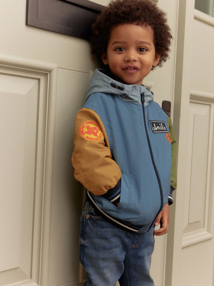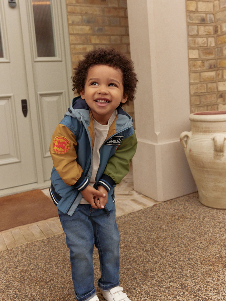 With a shower-resistant outer shell and a vintage-inspired varsity bomber design, this stylish navy blue and orange jacket has a breathable mesh lining, a zip fastening and side pockets, finished with ribbed hems. Shower-resistant outer shell Zip fastening Mesh lining Side pockets Ribbed hems Machine washable. Main 100% Recycled polyester. Lining 100% Recycled polyester. Country of Origin: Myanmar