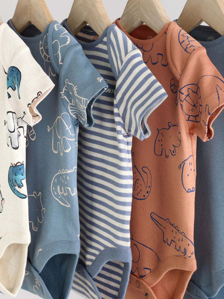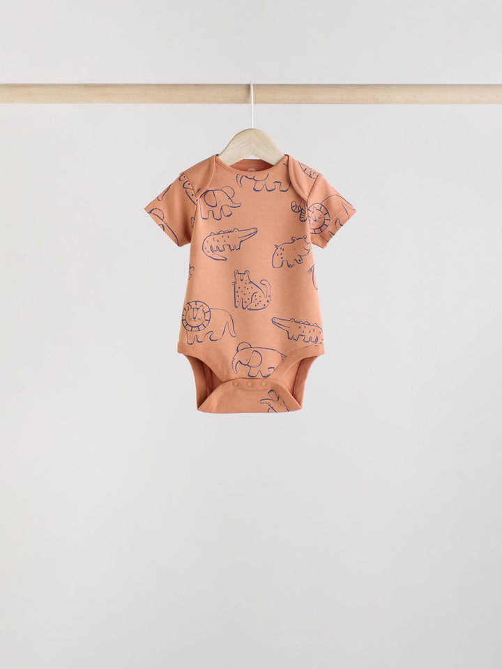 Navy/ Tan Brown Safari 100% Cotton Short Sleeve Baby Bodysuits 5 Pack