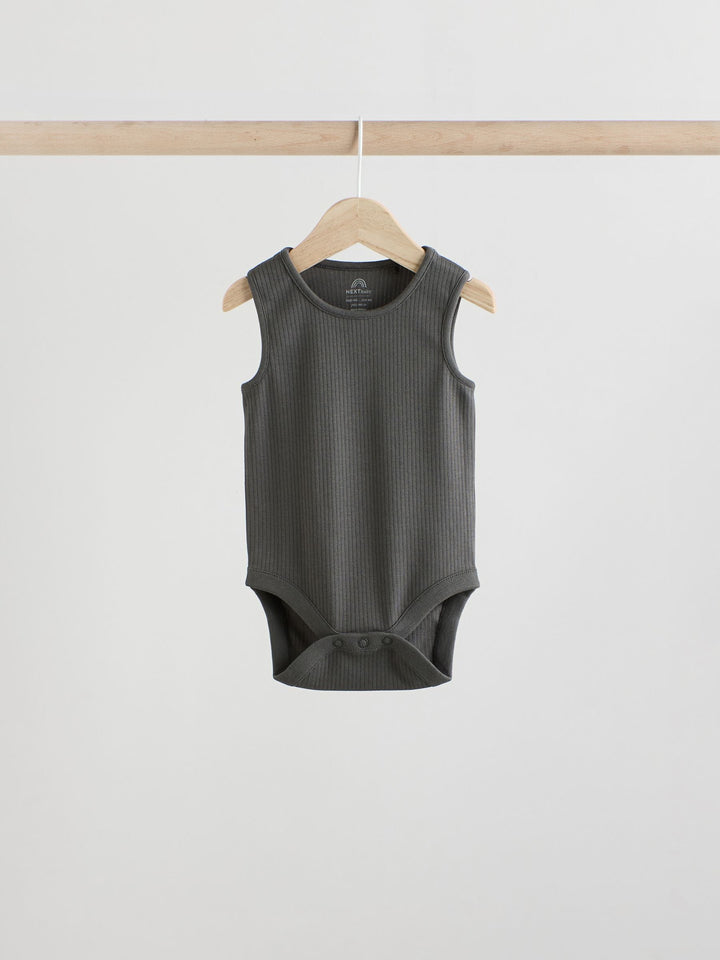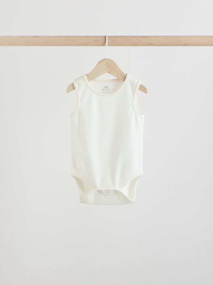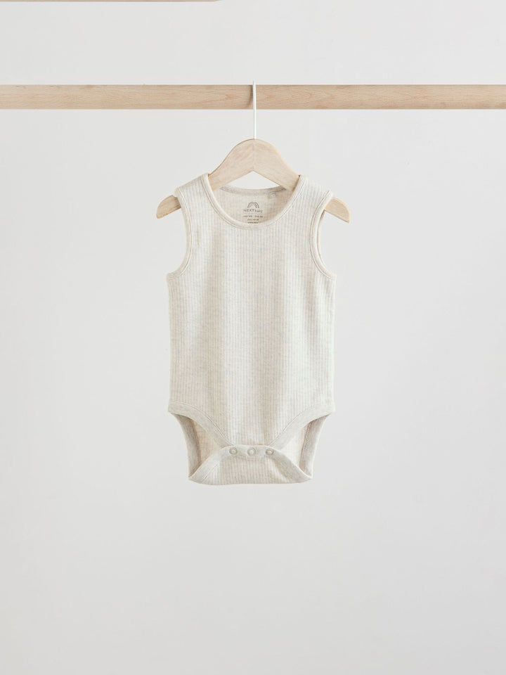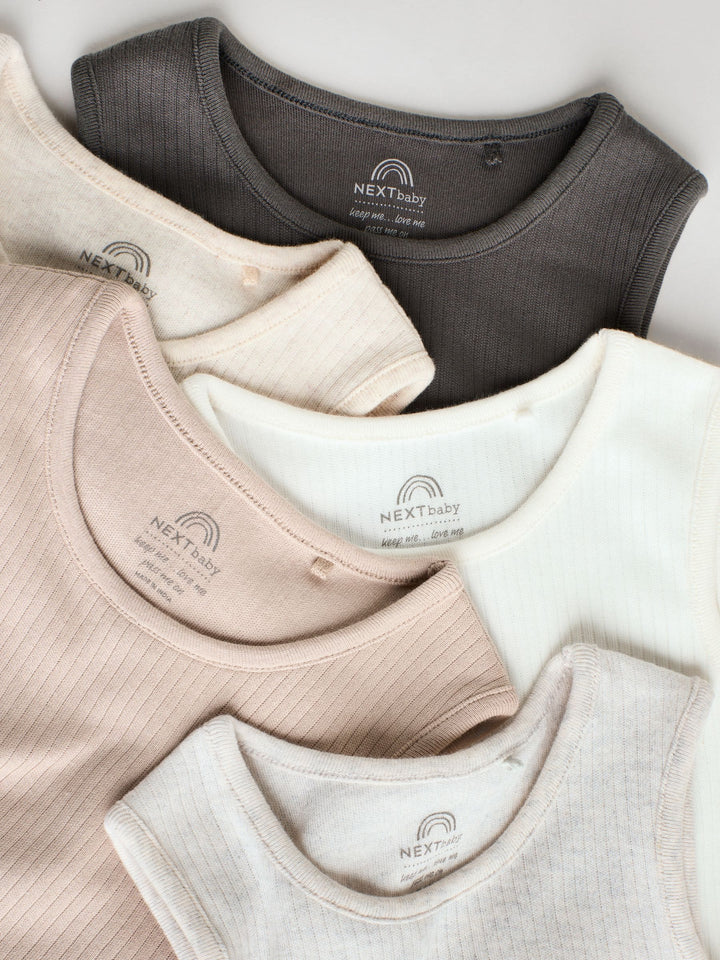 This 5-pack of sleeveless bodysuits are made from soft and comfortable cotton, with a ribbed texture and a popper fastening to the bottom for easy wear, in a selection of neutral hues. 5-pack 100% cotton Ribbed texture Popper fastening at the bottom Machine washable. 5 x Bodysuit 100% Cotton. Country of Origin: India Warning: Keep away from fire and flames.