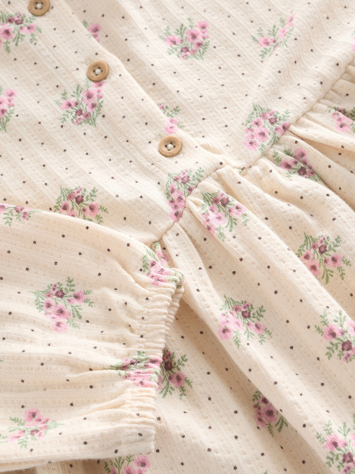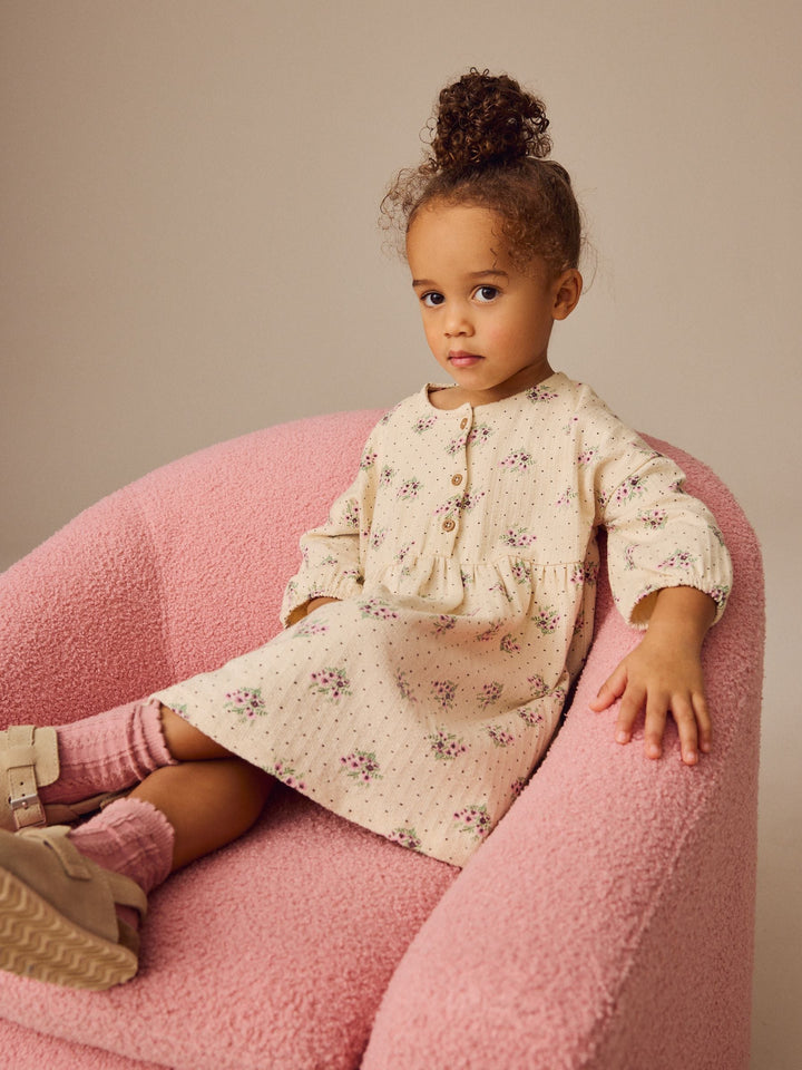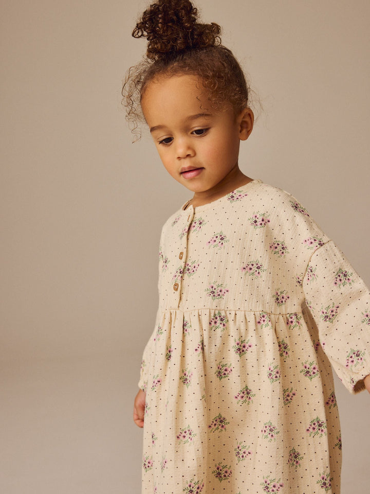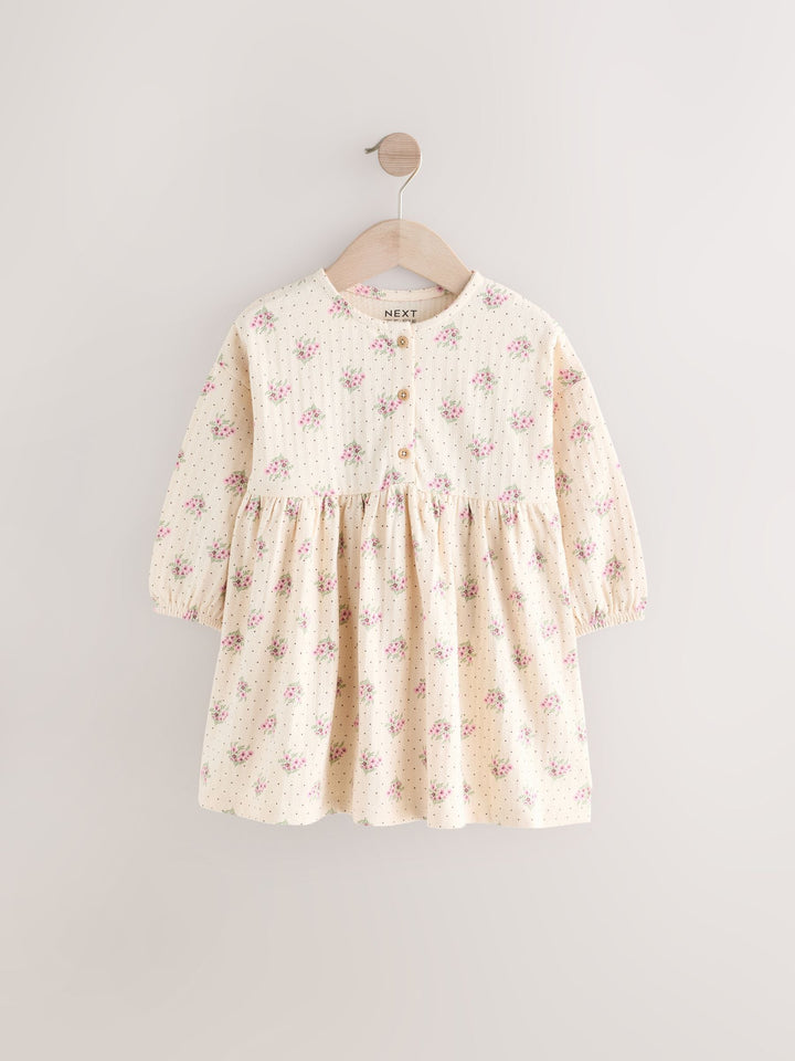 Made from a comfortable pure-cotton jersey fabric, this pretty dress has a textured feel with a button-up neck fastening, long sleeves with an elasticated sleeve cuff and an all-over ditsy flower print. 100% cotton Textured jersey fabric Button-up fastening Long sleeves Elasticated sleeve cuffs Ditsy flower print Machine washable. 100% Cotton. Country of Origin: India