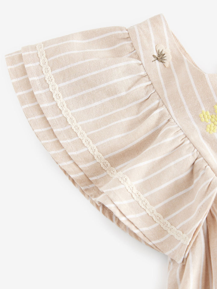 This super cute neutral stripe dress is made from pure cotton, featuring angel sleeve detailing and floral embroidery, a delicate lace trim and a square neckline. A button-fastening to the back makes dressing easy, finished with a comfortable cotton lining. 100% cotton Square neckline Angel sleeve Button fastening to the back Cotton lining Main 100% Cotton. Lining 100% Cotton. Country of Origin: India
