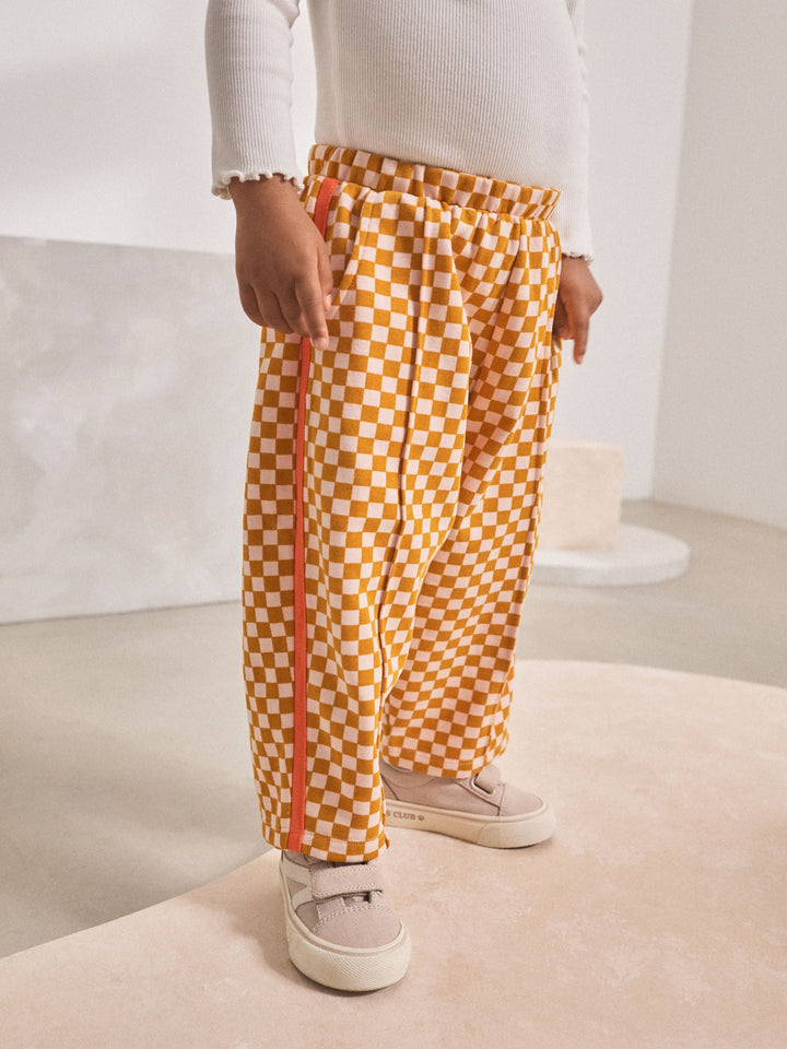 Ideal for little trendsetters, these orange checkerboard barrel leg trousers are both comfortable and stylish. The loopback jersey material and elasticated waistband provide all-day comfort, while the barrel-leg shape offers a modern silhouette. Checkerboard print Barrel leg shape Loopback jersey material Elasticated waistband Pockets Machine washable. 100% Cotton. Country of Origin: Bangladesh