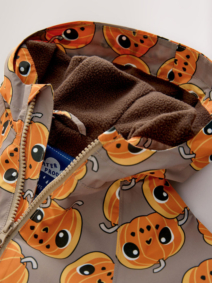 Make rainy-day adventures even more fun with our Halloween puddlesuit. This long-sleeved one-piece is fully waterproof and also lined with microfleece to keep him warm. Complete with taped seams, a zip fastening and a hood, he'll be high and dry even on the rainiest days. Fleece lined Zip fastening Long sleeves Elasticated cuffs Hooded Machine washable. Main 100% Recycled polyester. Lining 100% Recycled polyester. Country of Origin: Bangladesh