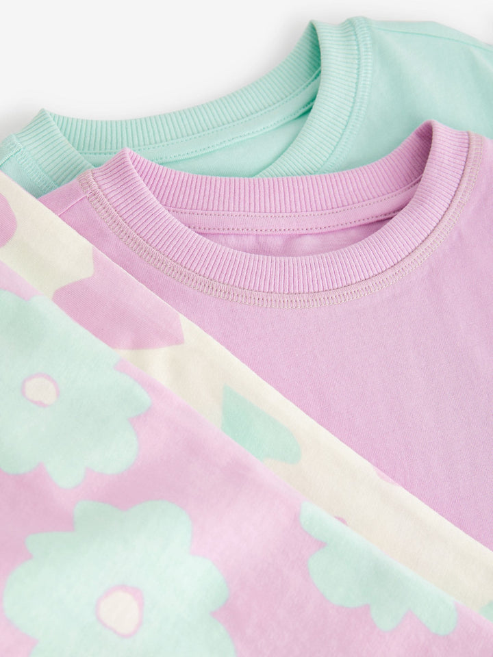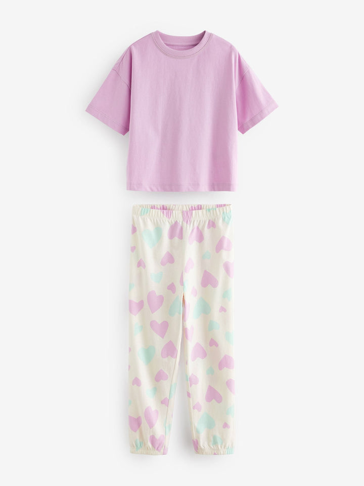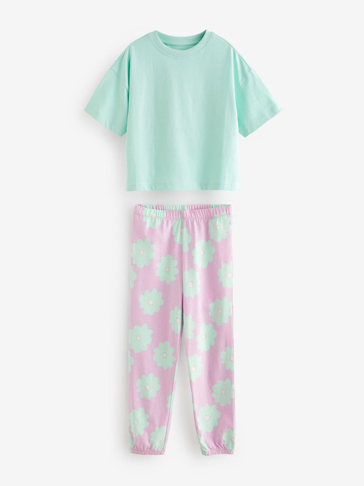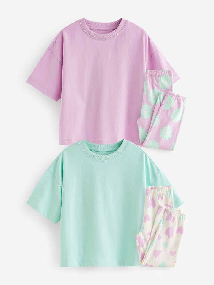 Made from pure cotton, this 2-pack of pastel purple and blue pyjamas includes a boxy short sleeve crewneck t-shirt alongside a pair of full-length jogger-style bottoms with an elasticated waistband. 2-pack 100% cotton Boxy fit t-shirts Full-length bottoms Machine washable. 2 x Pyjama Top and 2 x Pyjama Bottom 100% Cotton. Country of Origin: Bangladesh Warning: Keep away from fire and flames.