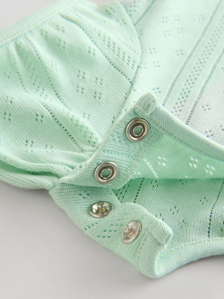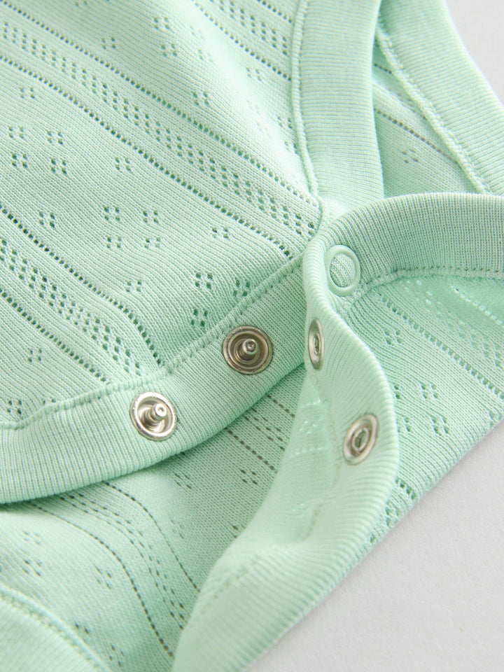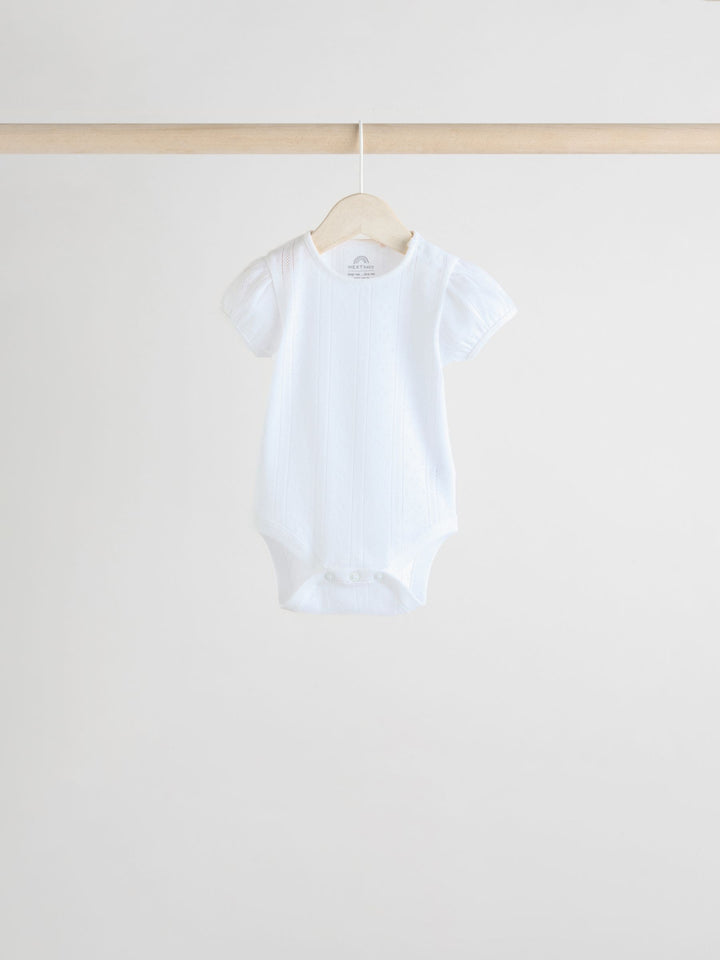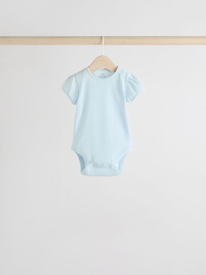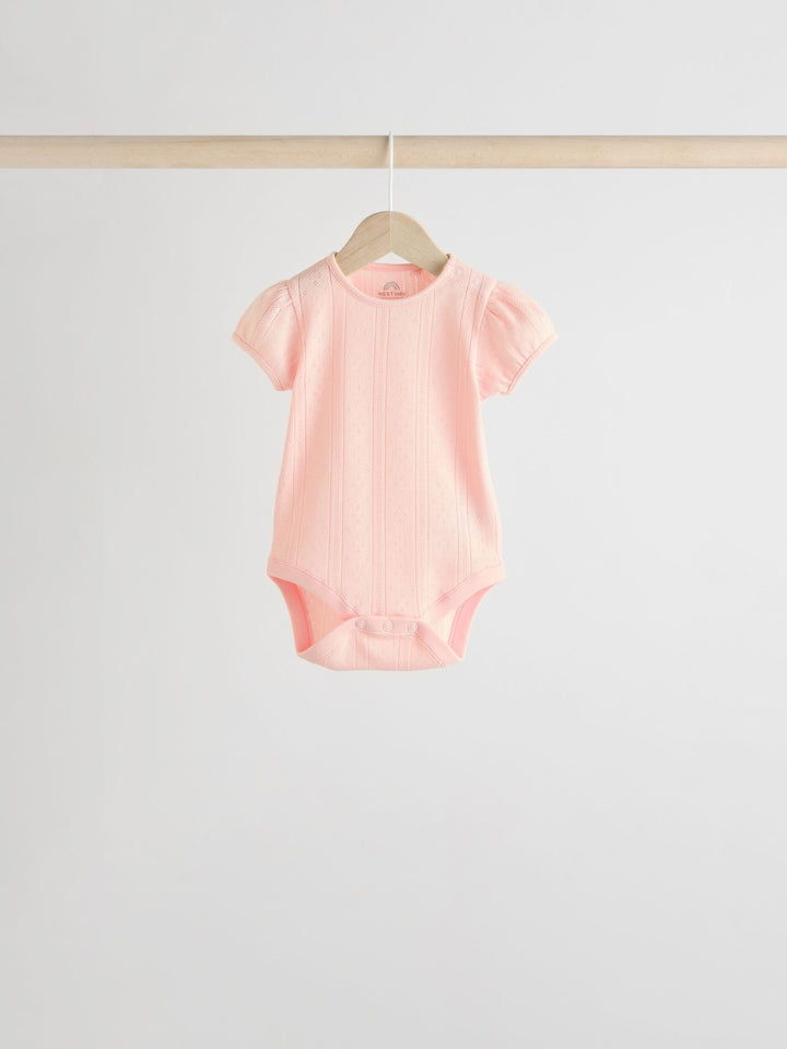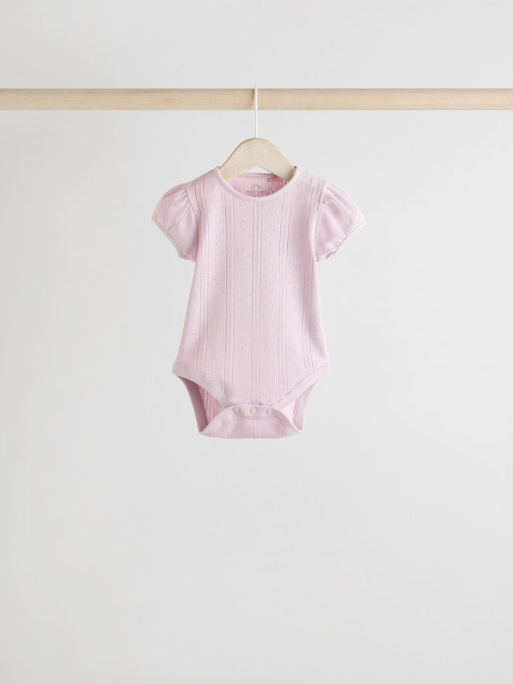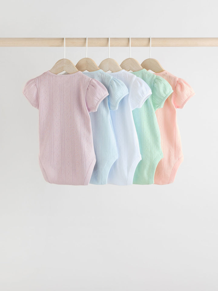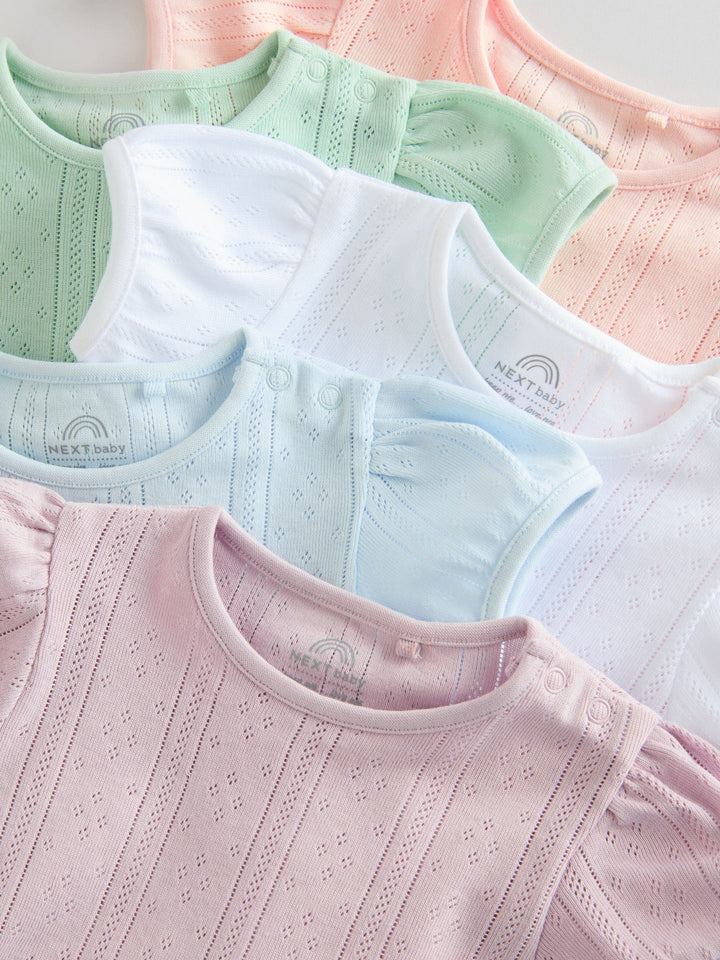 This essential 5-pack comes in a range of beautiful pastel shades, making them a delightful and practical addition to your baby's wardrobe. Crafted from super soft cotton, these bodysuits feel gentle against delicate skin, perfect for everyday wear. The charming pointelle knit adds a touch of delicate texture. Designed for easy dressing, they feature a practical envelope neck opening and convenient popper fastening at the crotch for quick nappy changes. 5 pack Super soft cotton Popper fastening Envelope neck opening Machine washable. 5 x Bodysuit 100% Cotton. Country of Origin: India Warning: Keep away from fire and flames.