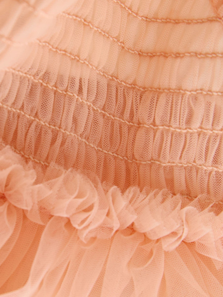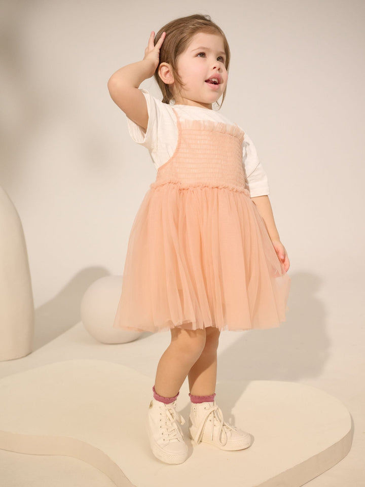 An instant wardrobe favourite, our peach pink short sleeve mesh dress and t-shirt dress has parties and play dates covered. Designed in a cute, 2 piece set, the mesh dress is shirred for easy dressing and the cotton tee offers a cool and comfortable finish. Whether it's for special occasions or princesses who demand dresses every day, we can't get enough of this sweet and stylish look. Mesh dress and t-shirt 2 piece set Shirred for comfort 100% cotton tee Machine washable. Dress 100% Nylon. T-shirt 100% Cotton. Country of Origin: India