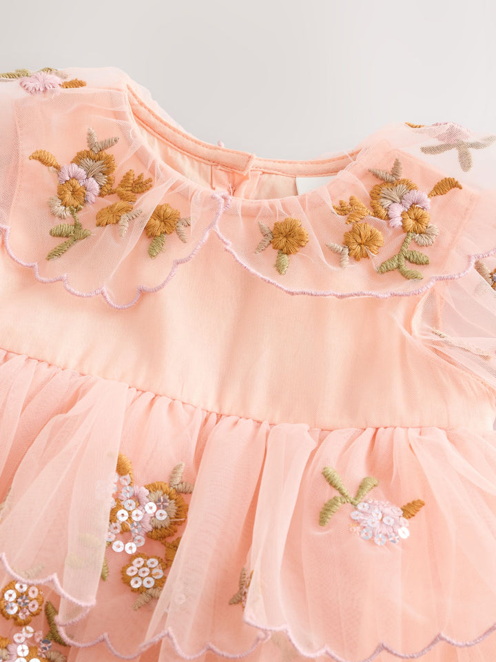 Let her be the best dressed guest in our peach pink embellished dress. Coated in stunning embroidered and sequin motifs, this short sleeve dress features a tiered mesh skirt and frill collar for a beautiful finish. Embroidered and sequin design Short sleeves Tiered skirt Frill collar Machine washable. Shell 100% Nylon. Lining 100% Cotton. Country of Origin: India