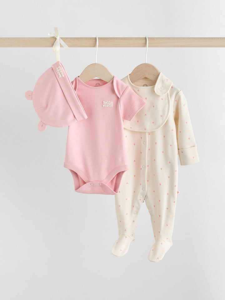 Pink 4 Piece Baby Sleepsuit, Bodysuit, Beanie and Bib Set (0-9mths)
