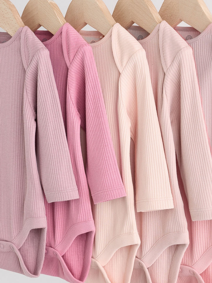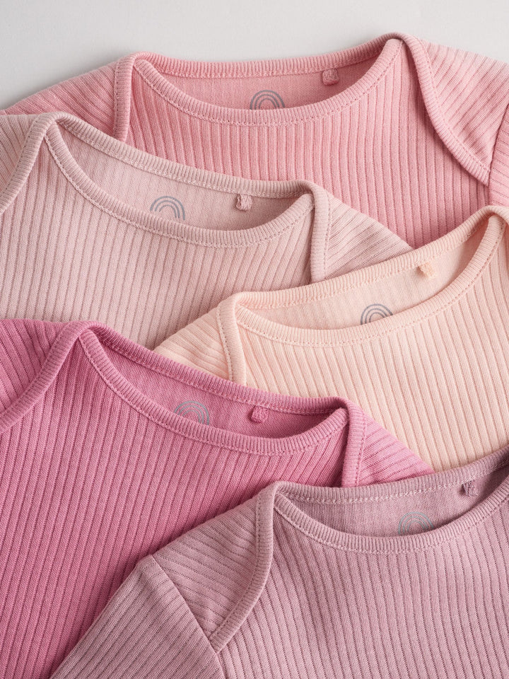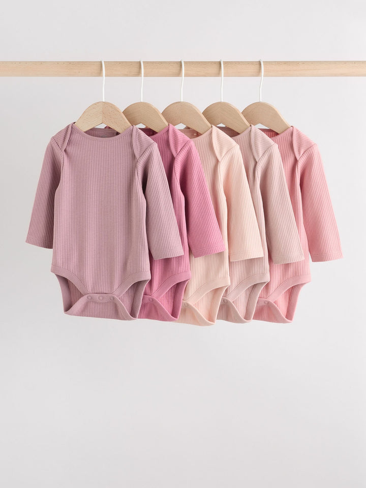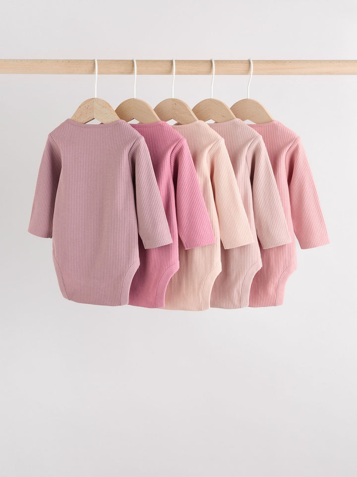 Stock up on a daily essential for your baby with this five-pack of pink long-sleeve bodysuits. The super-soft cotton fabric and envelope neck opening provide a comfortable and gentle feel, while the nickel-free popper fastenings ensure easy changes and protect against irritation. 5-pack Super soft cotton Envelope neck opening Popper bottom fastening Nickel-free poppers Machine washable. 5 x Bodysuit 100% Cotton. Country of Origin: India Warning: Keep away from fire and flames.