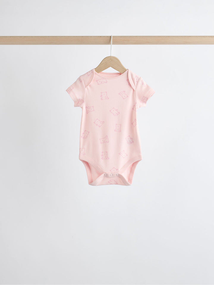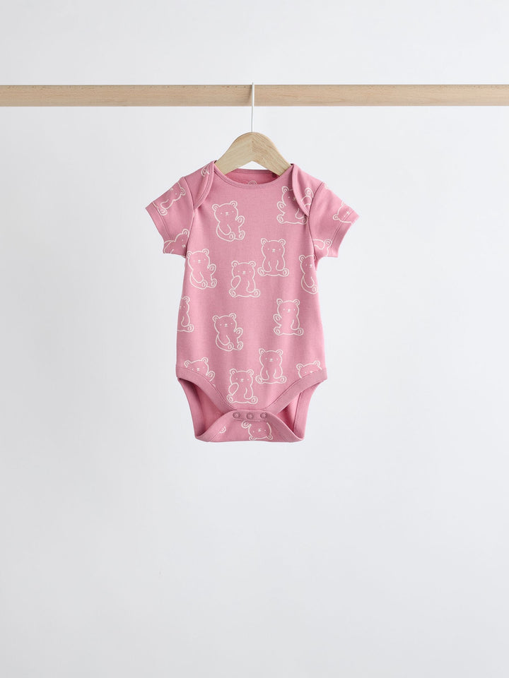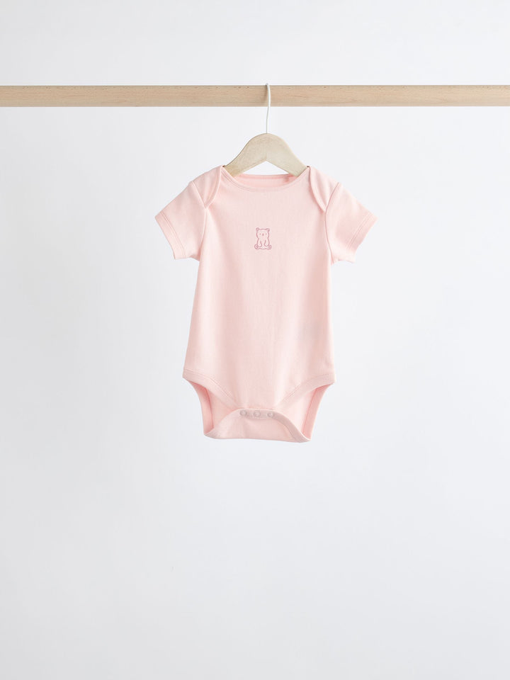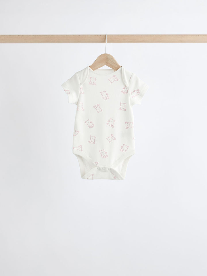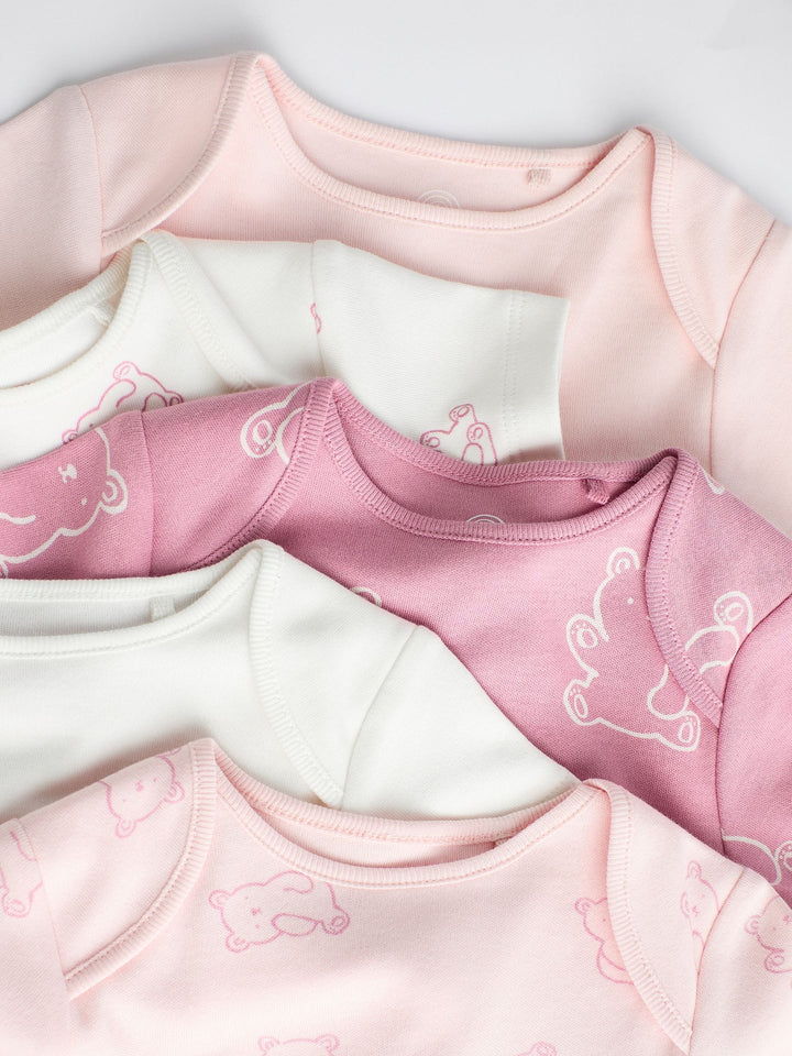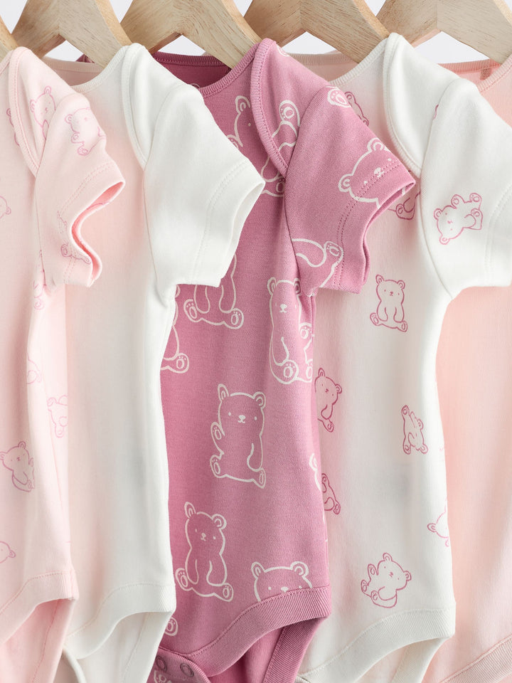 This 5-pack of pure cotton bodysuits feature plain and bear print pink and white designs, in a short sleeve shape with an envelope neck opening and a popper bottom fastening. Each bodysuit is free from harmful dyes or chemicals. 5-pack 100% cotton Printed and plain designs Envelope neck Popper fastening Machine washable. 5 x Bodysuit 100% Cotton. Country of Origin: Bangladesh Warning: Keep away from fire and flames.