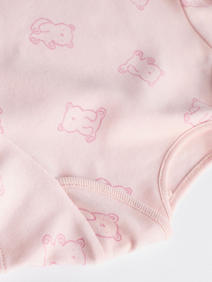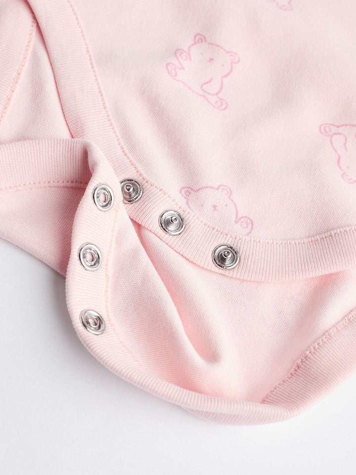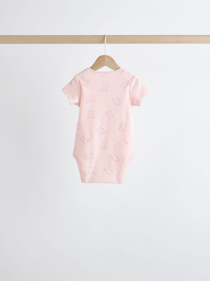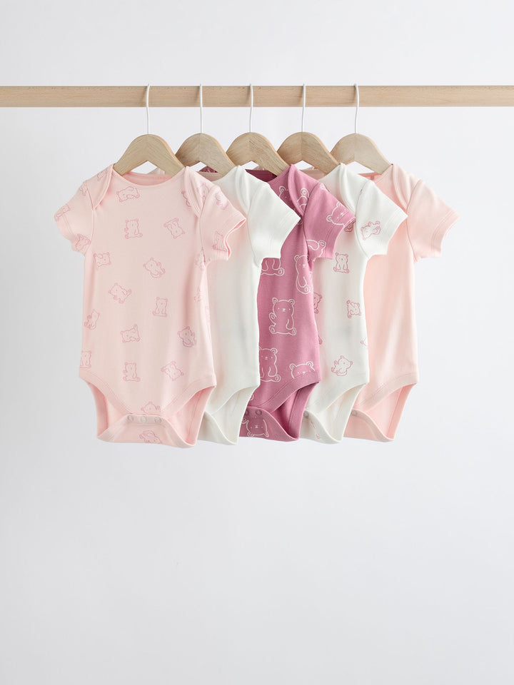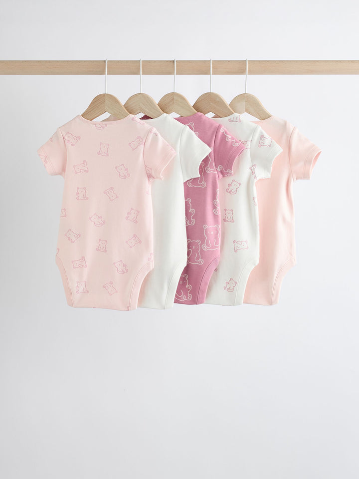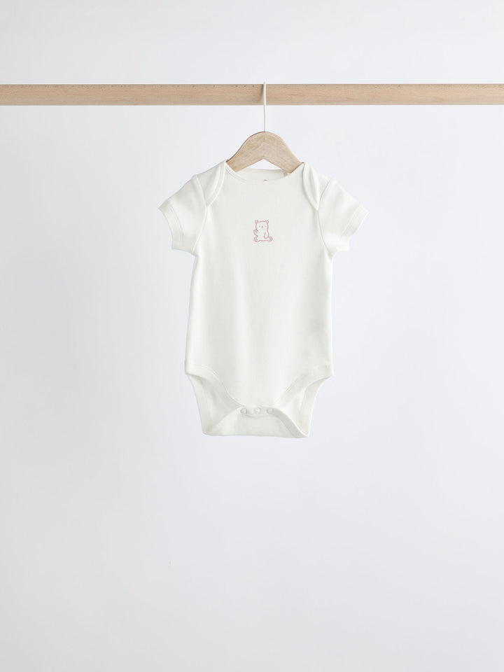 This 5-pack of pure cotton bodysuits feature plain and bear print pink and white designs, in a short sleeve shape with an envelope neck opening and a popper bottom fastening. Each bodysuit is free from harmful dyes or chemicals. 5-pack 100% cotton Printed and plain designs Envelope neck Popper fastening Machine washable. 5 x Bodysuit 100% Cotton. Country of Origin: Bangladesh Warning: Keep away from fire and flames.
