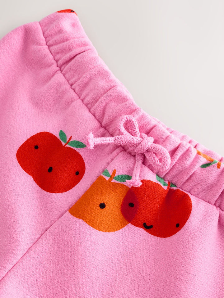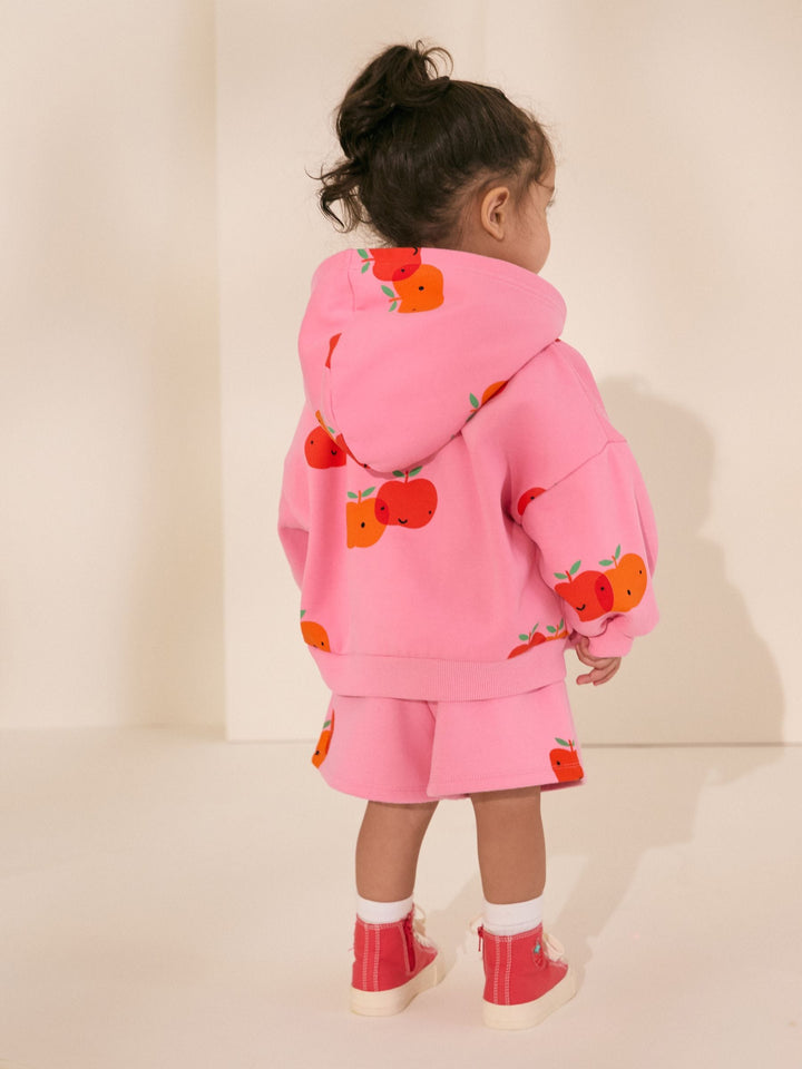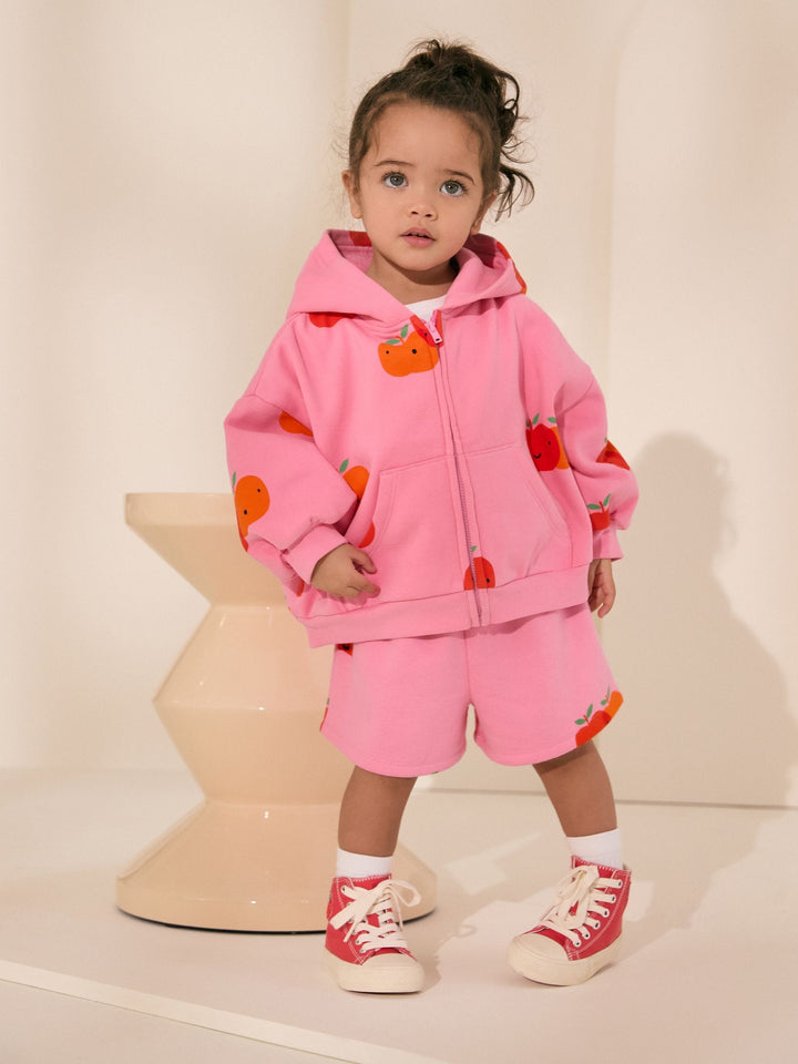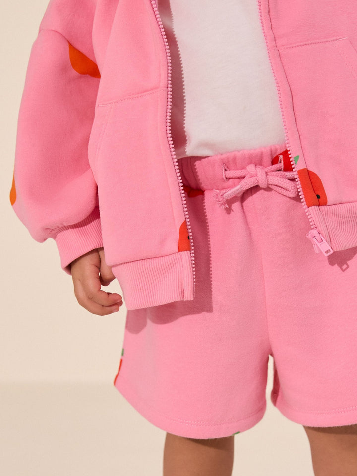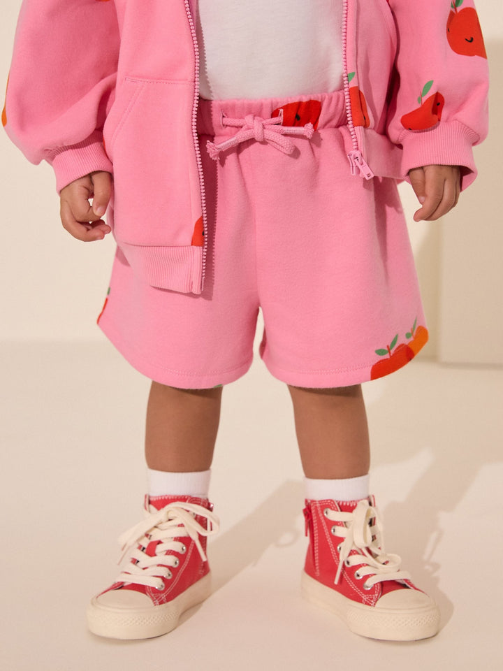 A summer standout, these pink apple cotton rich shorts are coated in a colourful print and feature pockets, a drawstring waist and are available with a matching zip-up hoodie. Cotton rich blend Drawstring waist Pockets Available with a matching zip-up hoodie Machine washable. 80% Cotton, 20% Recycled polyester. Country of Origin: Bangladesh