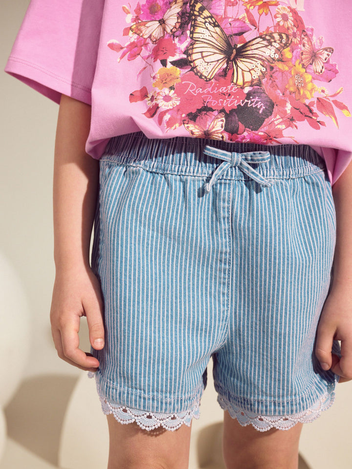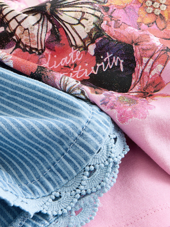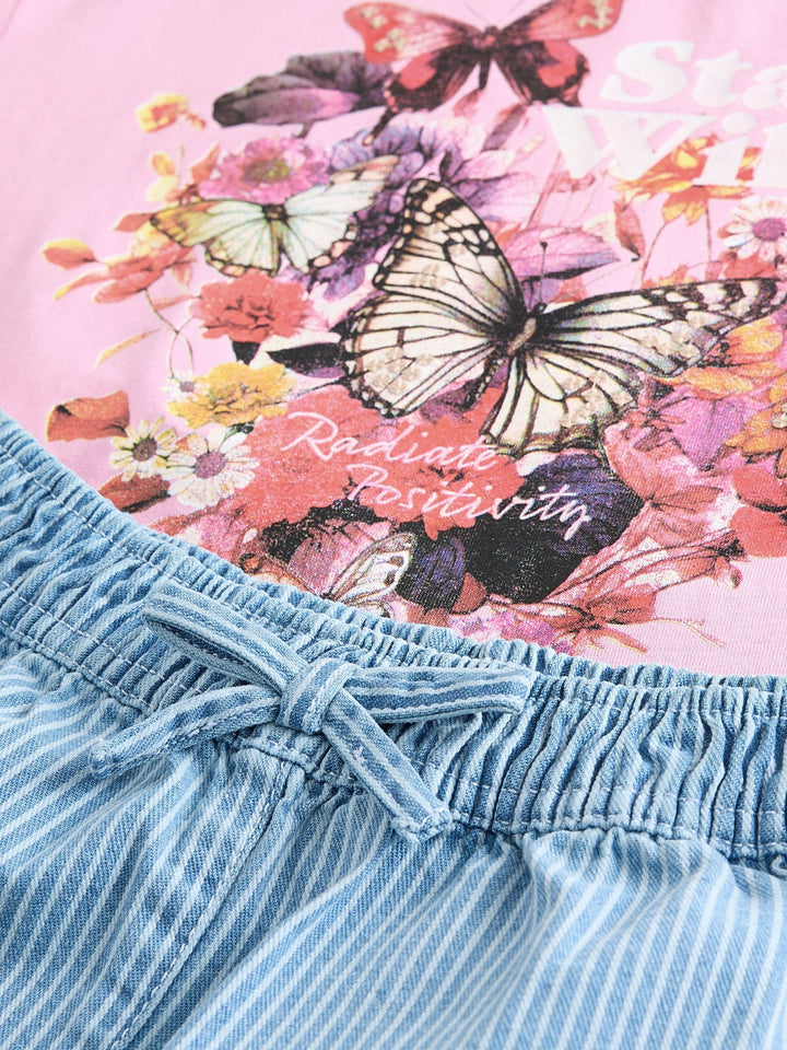 This pretty 2-piece set is a put-together summer outfit, featuring a short sleeve t-shirt made from pure cotton with a floral butterfly print to the chest, alongside a pair of blue denim shorts with a striped pattern and a lace trim. 2-piece set 100% cotton t-shirt Floral and butterfly print Blue denim shorts Striped design Lace trim T-shirt and Shorts 100% Cotton. Country of Origin: Bangladesh