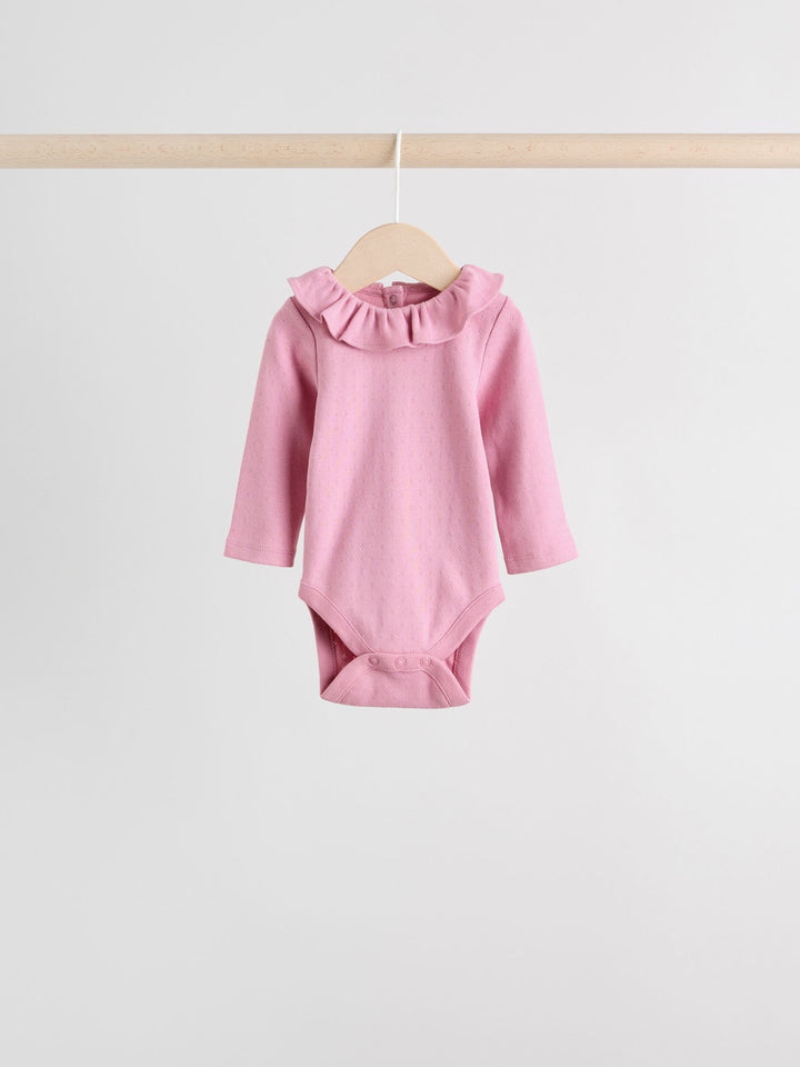 This 4-pack of bodysuits is ideal for keeping your little one well stocked in everyday staples, made from a cotton-rich blend fabric with added stretch, in a ribbed texture with long sleeves, frilled shoulders and a popper fastening to the crotch for easy changing. 4-pack 100% Cotton Long sleeves Frilled neck Popper fastening Machine washable. 4 x Bodysuit 100% Cotton. Country of Origin: Bangladesh Warning: Keep away from fire and flames.