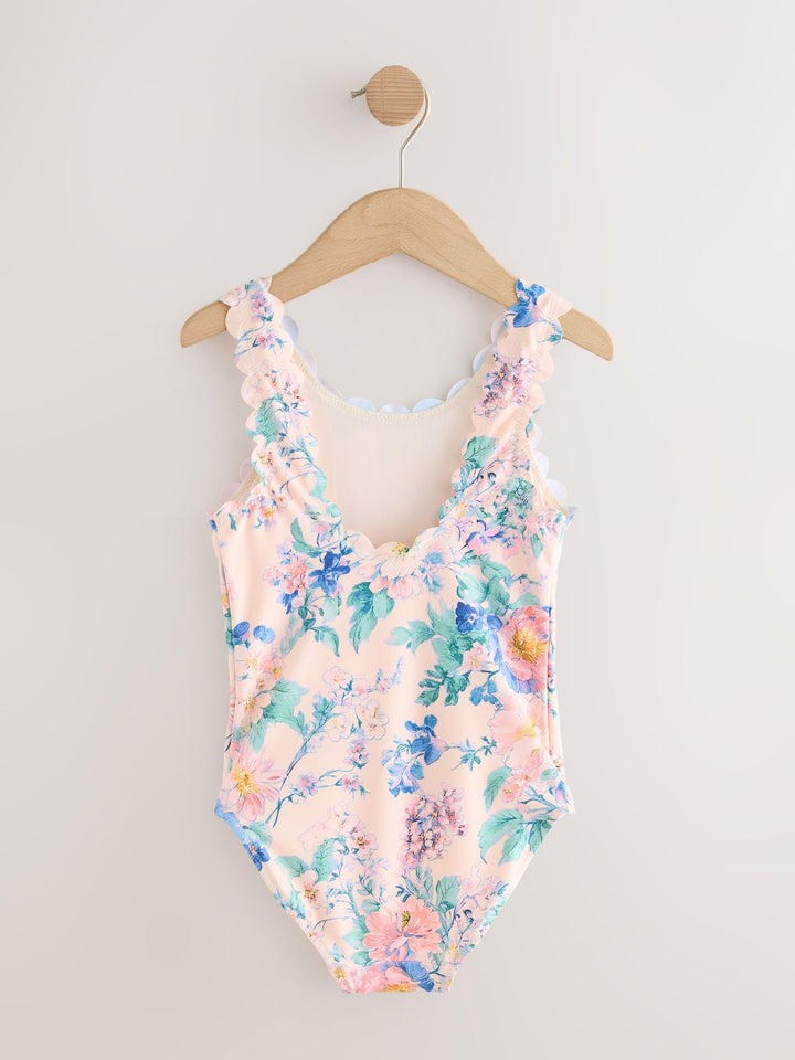 They'll be ready for the water in this charming pink floral swimsuit. The vibrant all-over floral print and delicate scallop edge detail on the straps add a sweet, feminine touch. Made from super stretchy fabric, this swimsuit ensures a comfortable and secure fit for all their swimming and holiday fun. Super stretchy fabric Scallop edge detail Floral print Low back Fully lined Machine washable. Main 82% Recycled polyester, 18% Elastane. Lining 92% Recycled polyester, 8% Elastane. Country of Origin: China