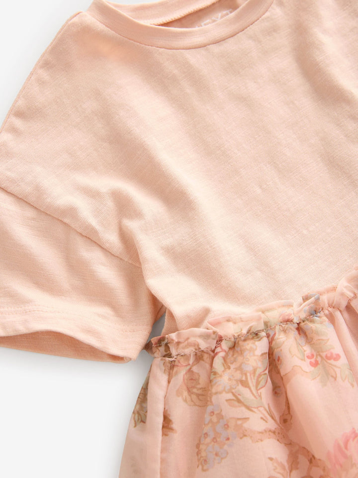 This beautiful pink floral dress has a comfortable cotton bodice with short sleeves and a crewneck collar, contrasting with the tiered mesh skirting with ruffle detailing, finished with a comfortable cotton lining. Ideal for parties. Cotton bodice Crewneck collar Short sleeves Tiered mesh skirting Ruffle detailing Cotton lining Machine washable. Main 100% Cotton. Lining 100% Cotton. Skirt 100% Recycled polyester. Mesh 100% Recycled polyester. Country of Origin: India