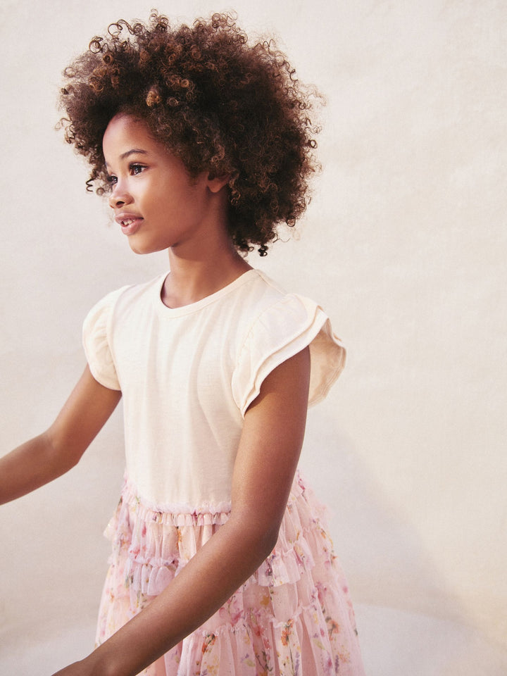 This gorgeous dress has a casual t-shirt style bodice made from pure cotton, featuring a double layer short sleeve and a round collar, alongside a tiered mesh skirt with floral detailing and added sparkle. 100% cotton jersey top Double-layered short sleeves Mesh skirt Tiered design Floral and sparkle detailing Machine washable. Main 100% Cotton. Skirt 100% Recycled polyester. Skirt Lining 100% Cotton. Country of Origin: India
