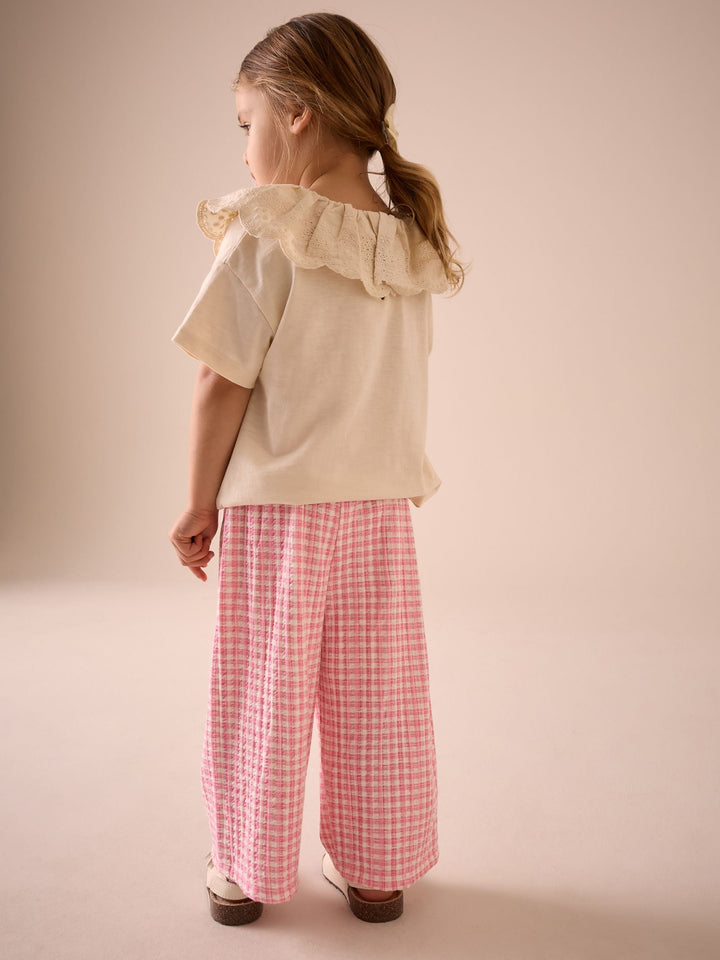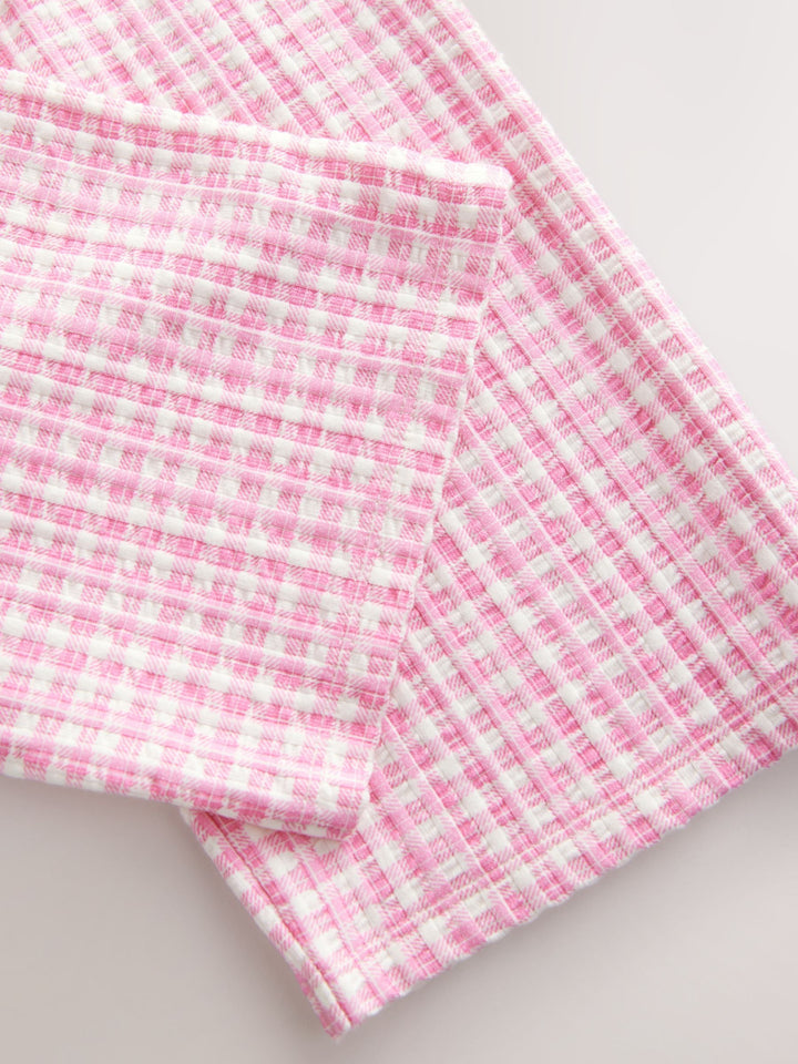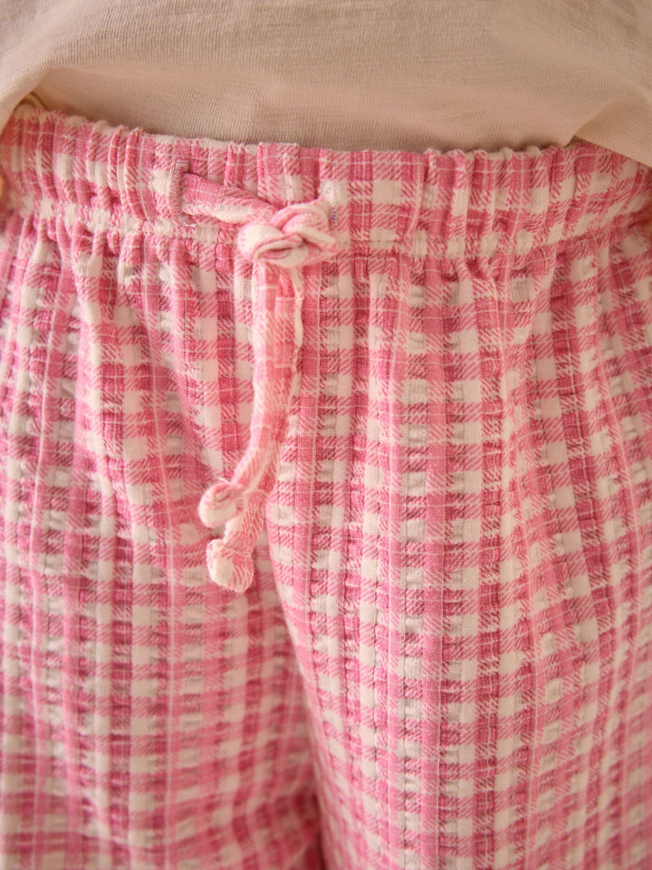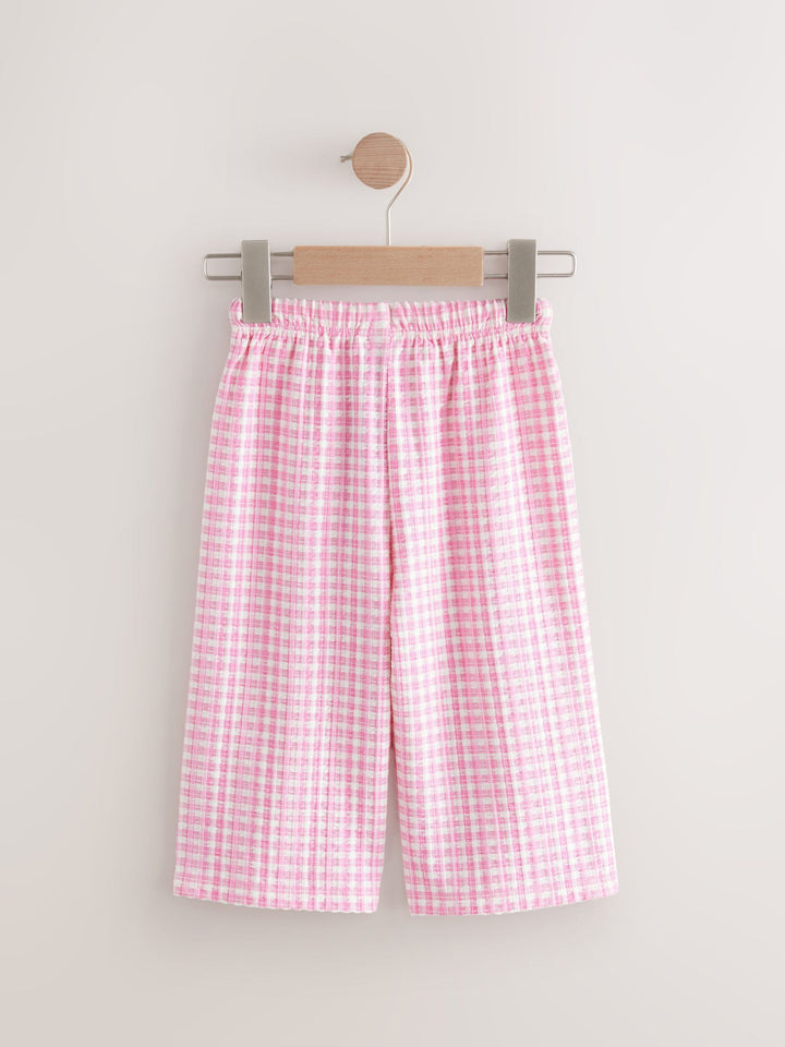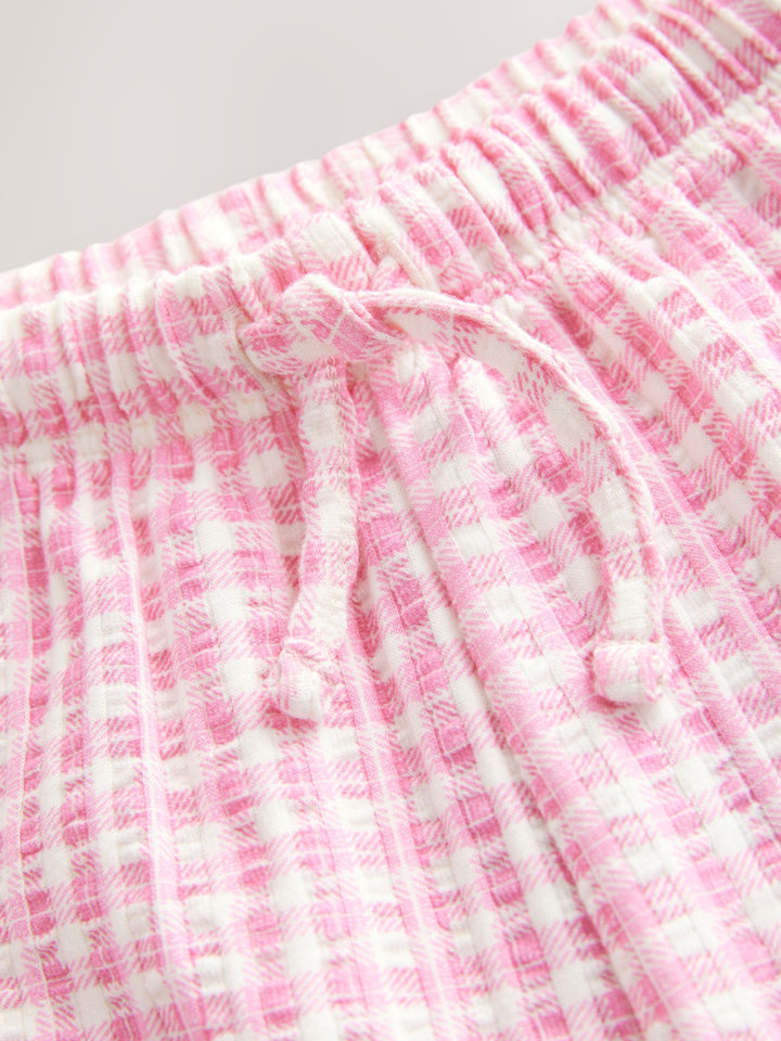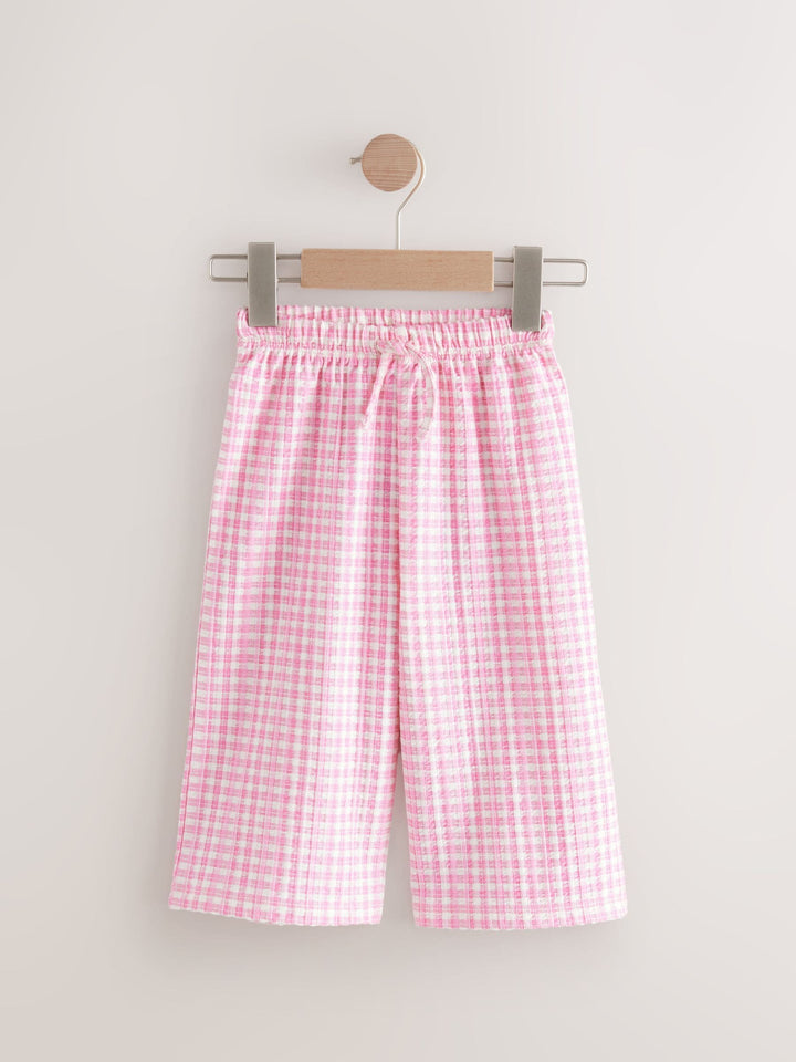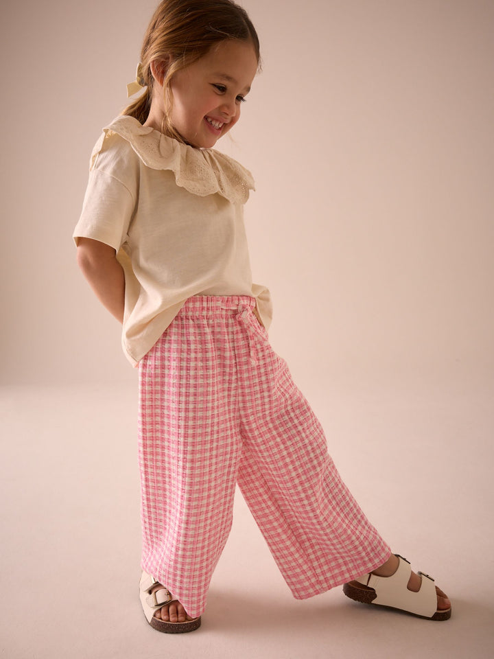 They'll love the easy pull-on style of these pink gingham print wide leg trousers, made from a cotton fabric in a textured finish with a crinkle effect, a comfortable elasticated waistband and an adjustable drawstring for the perfect fit. Wide leg 100% cotton Crinkle texture Elasticated waistband Drawstring Machine washable. 100% Cotton. Country of Origin: India