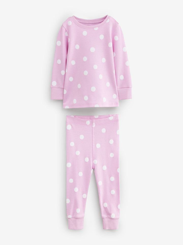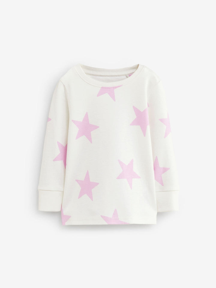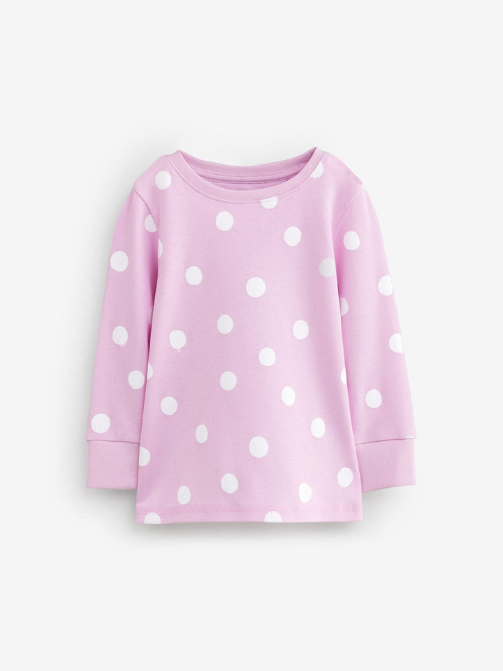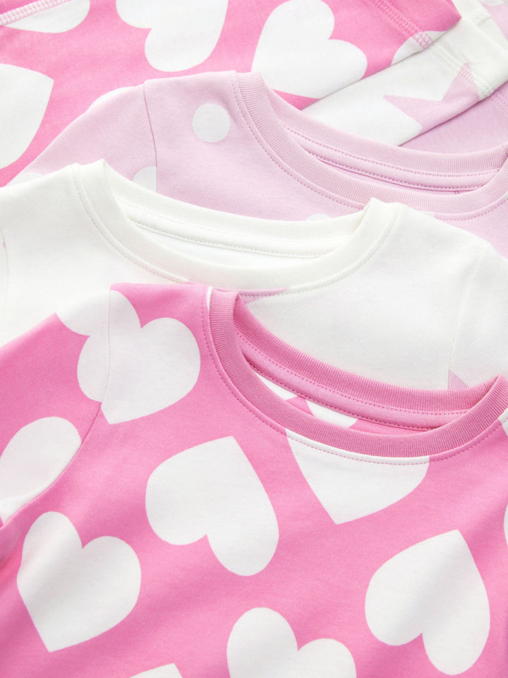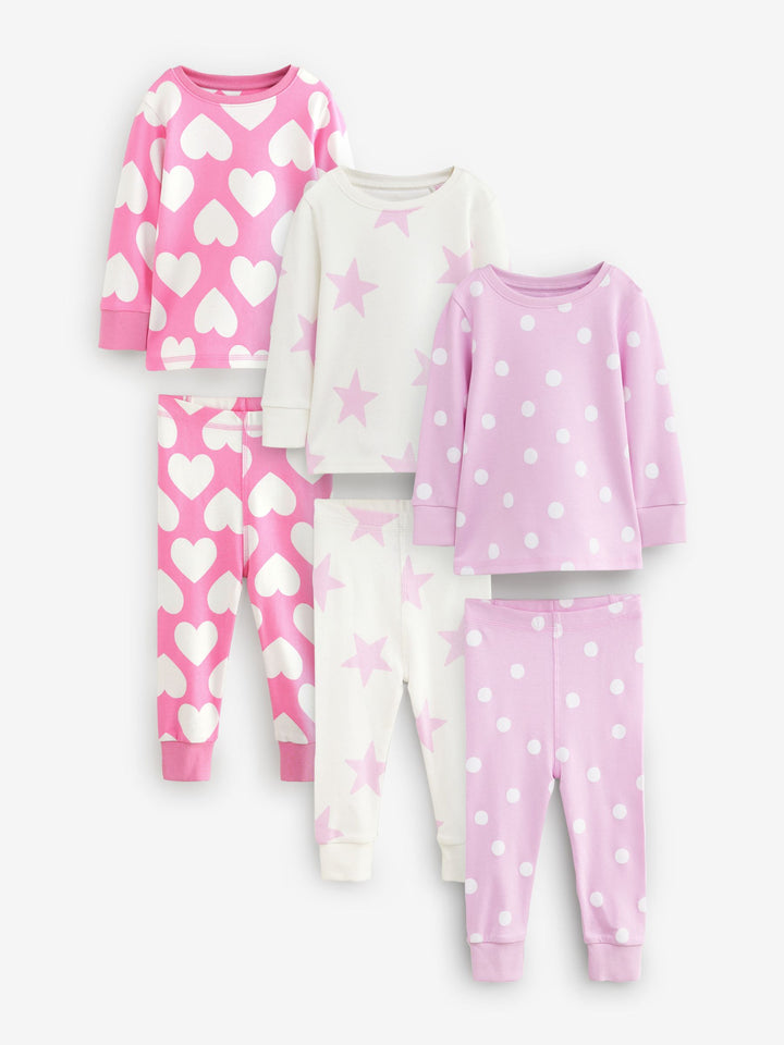 This handy 3-pack of pure-cotton pink, white and purple pyjamas feature heart, star and spot prints, with a soft feel across long sleeve tops with crewneck collars and full-length bottoms with an elasticated waistband. 3-pack 100% cotton Long sleeve tops Crewneck collar Full-length bottoms Elasticated waistband Cuffed ankles Side pockets Machine washable. 3 x Pyjama Top and 3 x Pyjama Bottom 100% Cotton. Country of Origin: Bangladesh Warning: Keep away from fire and flames.