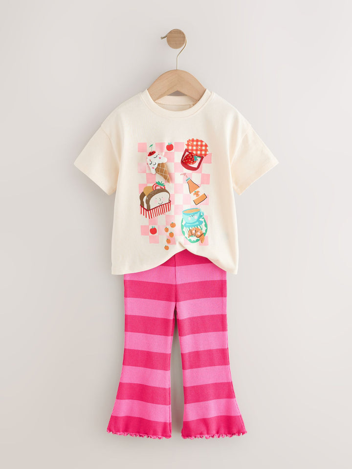 She'll be stepping out in style this season in our super cute t-shirt and flare leggings set. Featuring a short sleeve t-shirt with fun 3D padded picnic food on the front and a pair of coordinating soft and stretchy striped flared leggings. 2 piece set Short sleeve t-shirt Flare leggings Machine washable. T-shirt 100% Cotton. Leggings 94% Cotton, 6% Elastane. Country of Origin: Sri Lanka