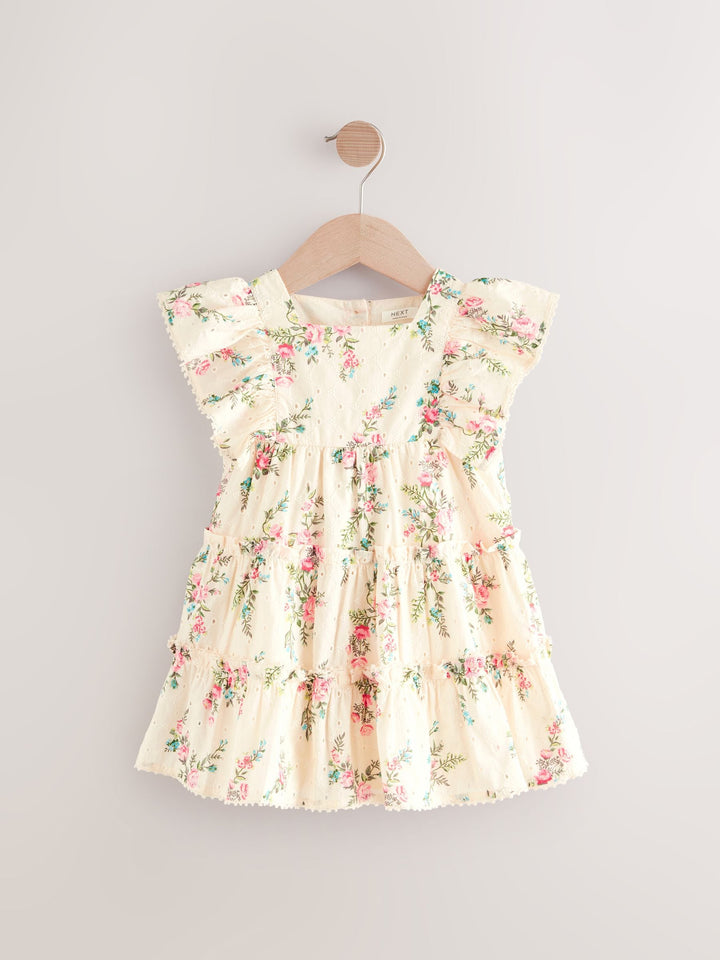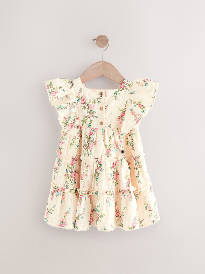 A delightful dress for special occasions, this pure cotton dress is designed in a tiered shape with a stunning floral print and broderie detailing. Frill sleeves and lace trim beautifully complete this piece with button-back fastening for easty dressing. 100% cotton Tiered shape Floral print Frill sleeves Broderie detailing Button-back fastening Main 100% Cotton. Lining 100% Cotton. Country of Origin: India